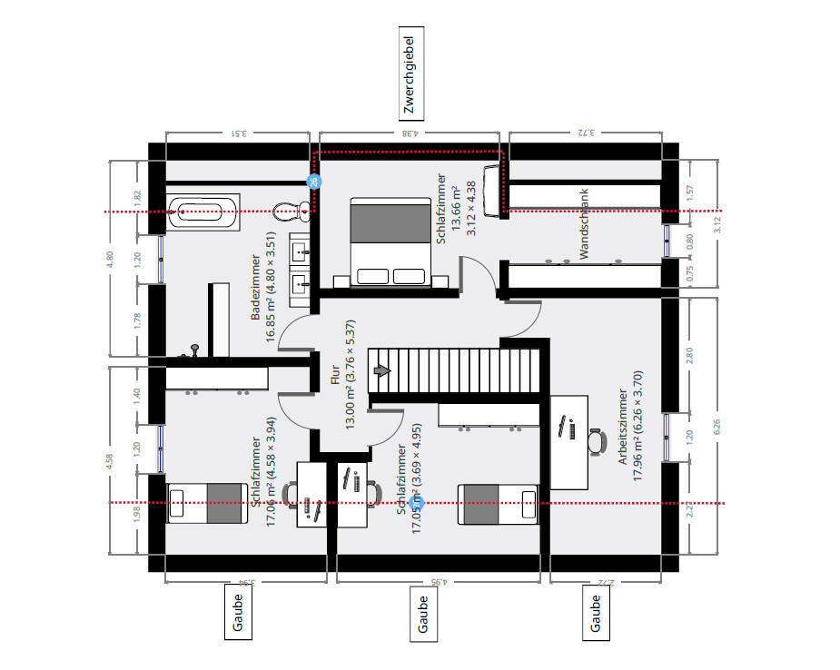 Bzgl. OG habe ich eine neue Version angehängt: ypg du hast gutes Augenmaß -> da hat tatsächlich mit der 2m Linie einiges nicht gepasst. Habe versucht das zu verbessern mit zwei "Toträumen". In allen anderen Zimmern sollte es eigentlich durch Zwerchgiebel und Gauben passen? Ehebett sollte passen, denn bis auf wenige Zentimeter ist das Zimmer exakt so wie unser heutiges Schlafzimmer und das finden wir super. Ist halt wirklich nur Bett, Nachtisch und etwas Wäsche drin.