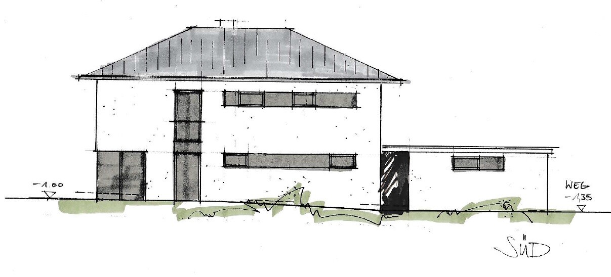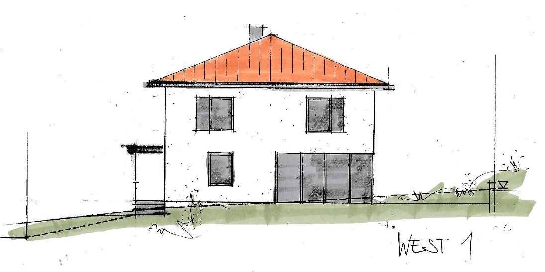 weitere Wünsche/Besonderheiten/Tagesablauf: Wichtigster Punkt: etwas Abschirmung zum Nachbar im Süden. Wir haben einen sehr schönen Fernblick im Osten, Vorgabe war deshalb an dieser Seite das Büro (Homeoffice) und das Schlafzimmer zu haben. Zudem wollten wir die Kinderzimmer etwas abgeschirmt haben