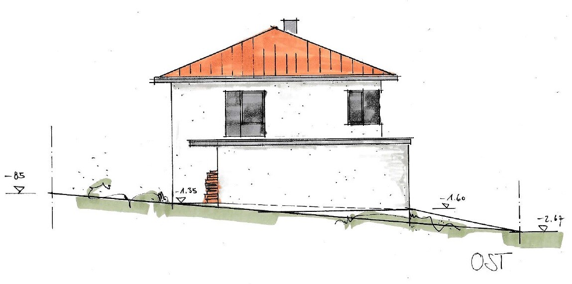 Zum Grundstück: wir haben Hanglage, über das Grundstück verteilt sind es ca. 2,5 Meter. Der Hauptteil davon entfällt aber auf eine parallele Kante in der Nähe der Straße. Deshalb setzen wir das Haus 5 Meter von der Straße weg und können hier problemlos ohne Keller bauen, da das Grundstück in diesem Bereich relativ flach ist. Im Süd-Osten bleiben dadurch nur 4 Meter Garten übrig, hier ist aber das Nachbarhaus sehr nah an der Grenze und wir würden diesen Teil des Gartens sowieso nicht nutzen.