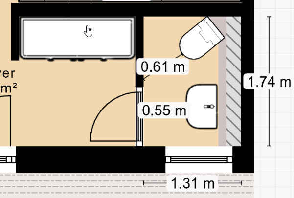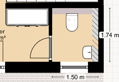 Wenn der Schacht jedoch oben bleibt wird mir das alles zu eng. Ich habe den Schacht nun nach rechts platziert. Der Abstand Toilette zur gegenüberliegenden Wand ist ca. 60cm, Waschtisch zur gegenüberliegenden Wand ca. 55cm.
