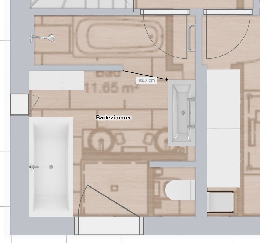 - Platz zwischen Ecke Duschwand und Waschbecken ist aktuell 73cm Grundriss 1 und 95cm Grundriss 2.