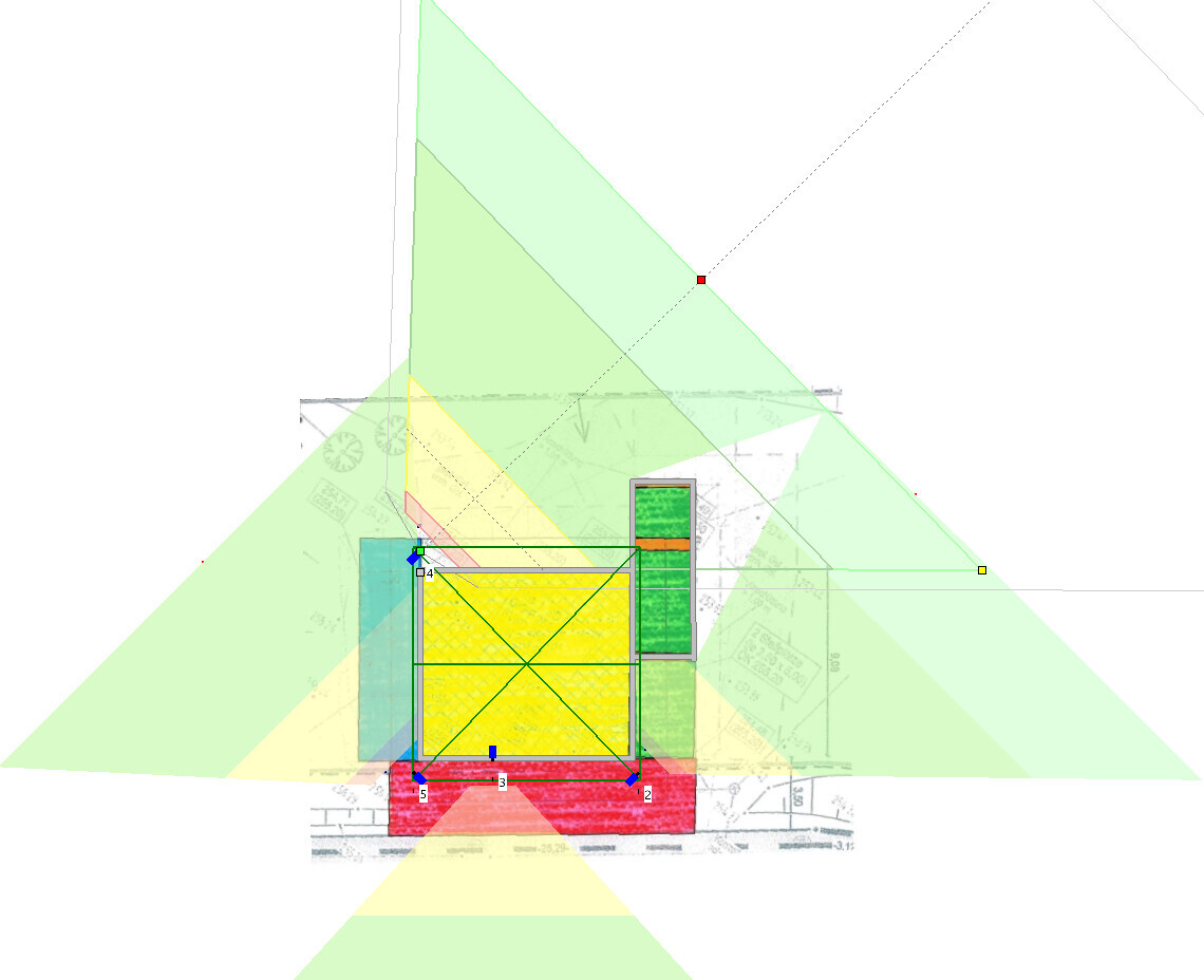 Hier wären meine Überlegungen fürs Grundstück für die Kameras. In der Front die Türklingelkamera, dann statt nur bei NW und SO noch bei SW eine dritte Kamera. Dann wäre ein Großteil des Grundstücks abgedeckt.