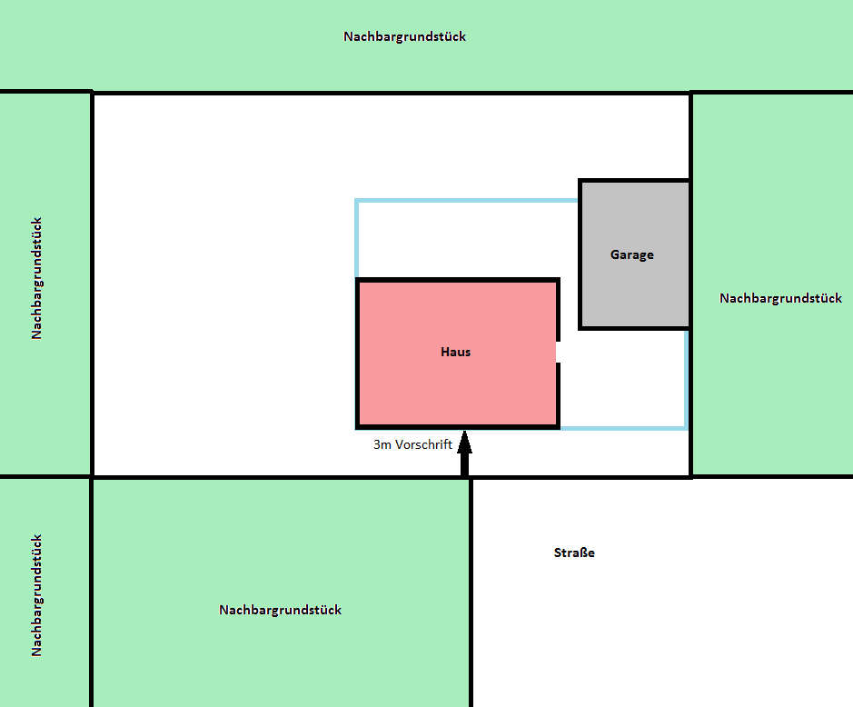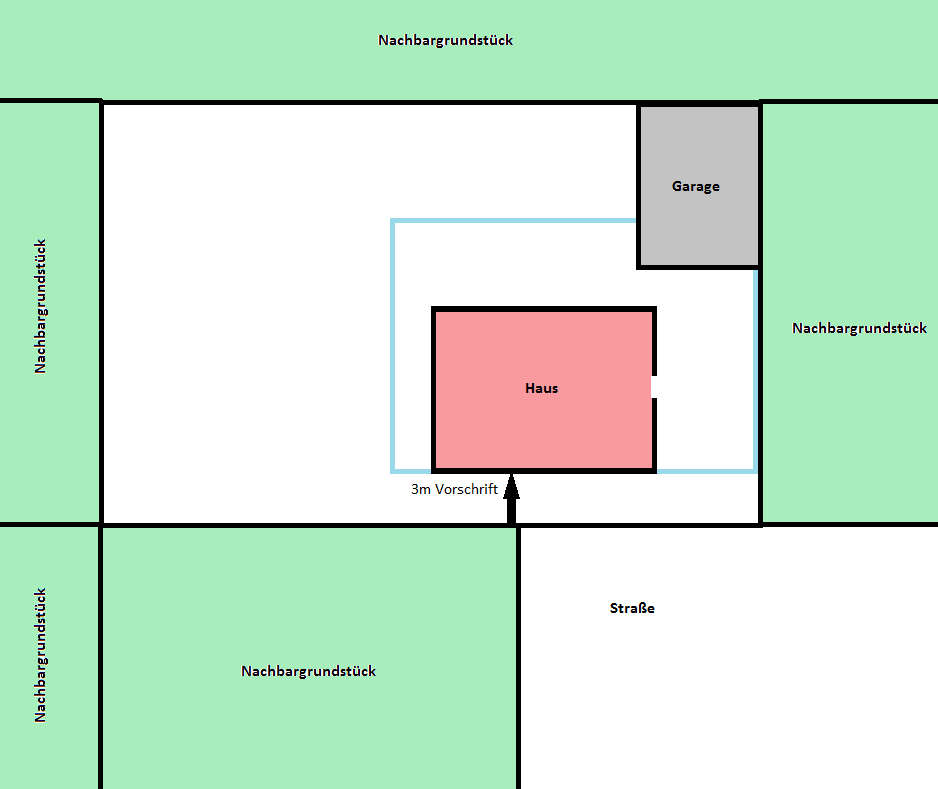 Baufeld (blau) 18x12 wobei 3 Meter hinter der Grundstücksgrenze gebaut werden MUSS.