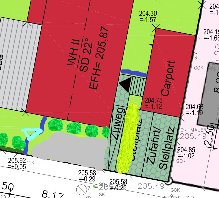 Hellgrau ist der neue Stellplatz (sozusagen als Parkbucht), dunkelblau ist Zaun, hellblau ist ein kleines Gatter, und die mittelgrünen Punkte sind Bepflanzung (Büsche, Sträucher, Stauden, Hecke, etc). Also kein Zaun an der Straßengrenze - weder bei Stellplatz, noch bei Zuwegung. Stattdessen nur vor dem neuen Stellplatz sowie hinter den Hauseingang (plus evtl rechts der Zufahrt Carport - dazu muß man die Situation vor Ort kennen).