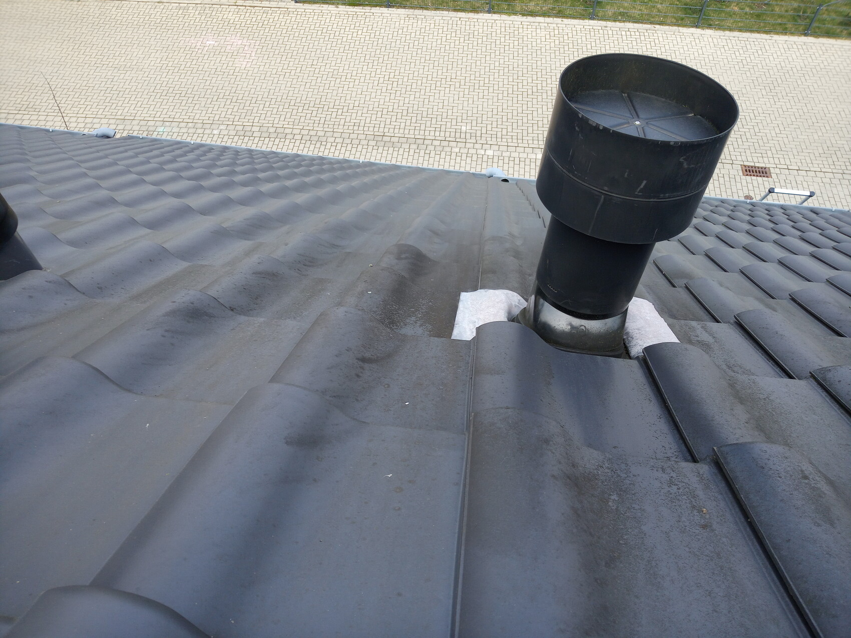 Ende 2020 habe ich dann etwas viel schlimmeres festgestellt: Die gelieferte Dachdurchführung DH160-KS besteht aus einem Stutzen und einer Bleischürze. Diese Bleischürze gibt es in 2 Farben. Wir haben zu den anthrazit farbenen Dachpfannen die schwarze Version gewählt. Was ist passiert? Die Farbe hat sich komplett gelöst und auf den anliegenden Dachpfannen verteilt. Von Pluggit gibt es keine Stellungnahme. Ich habe nach mehreren Wochen leider keine Antwort erhalten. Wer sich so etwas einbauen will, möge sich die Fotos anschauen. Den Schaden beziffere ich auf etwa 1000 €, weil Pluggit offensichtlich nicht wetterfeste Farbe für den Außenbereich verwendet hat.
