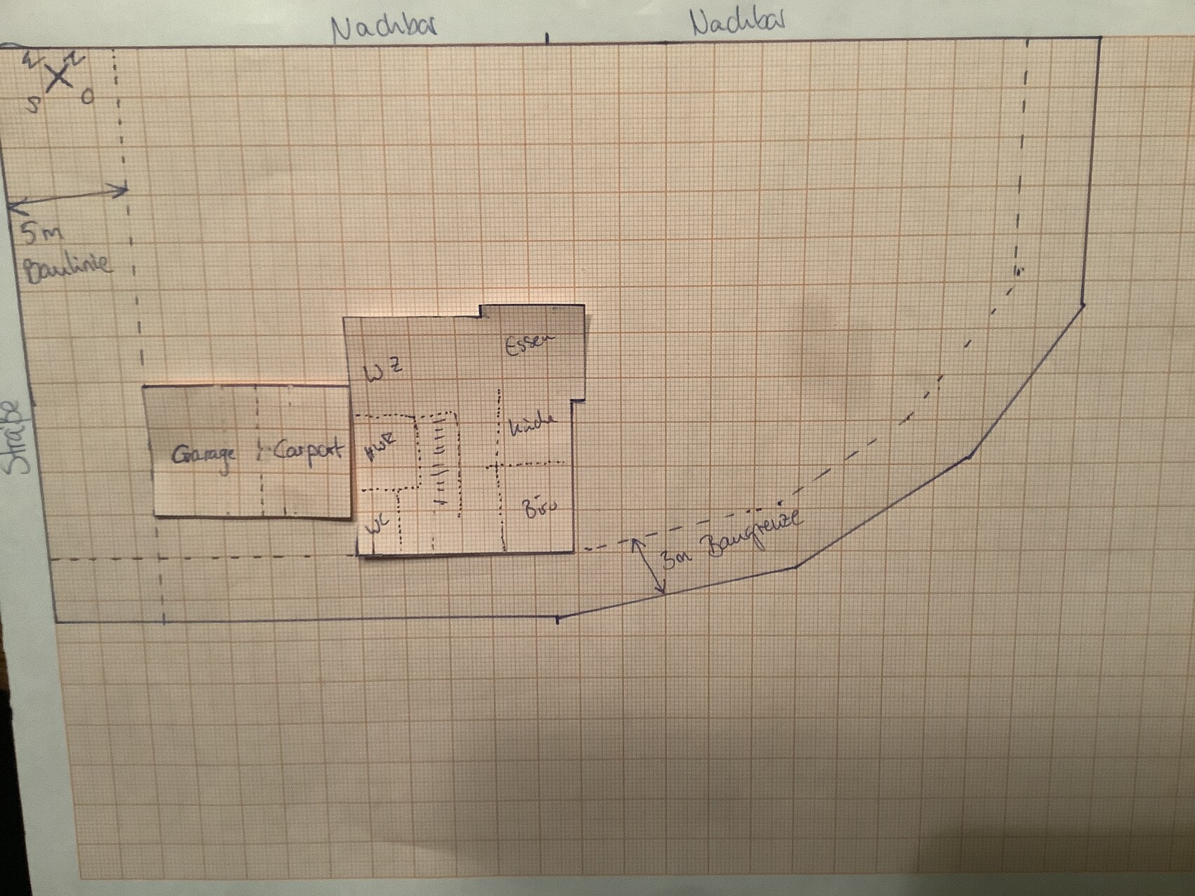 Ich habe unsere derzeit favorisierte Idee mit angehängt. Gut gefällt uns dabei, dass ein Stückchen Süd-West-Garten herausspringt. Außerdem gefällt uns, dass durch die Garage der Abstand zur Straße noch einmal größer wird. Allerdings sind wir unsicher, ob man auf diese Weise die Baulinie einfach umgehen kann, insbesondere auch mit der Garagen-Carport-Kombination (siehe Plan). Ungünstig ist natürlich die Garage im Süden. Außerdem ungünstig, die großen Fenster des Wohnbereiches zeigen nach oben zum Nachbar, der der Meinung war sein Grundstück ordentlich aufschütten zu müssen. Da aber zumindest sein Haus schon steht, ist keine weitere Bebauung in dieser Größenordnung zu erwarten. Ungünstig ist natürlich, dass wir höhenmäßig unter ihm bauen müssen.