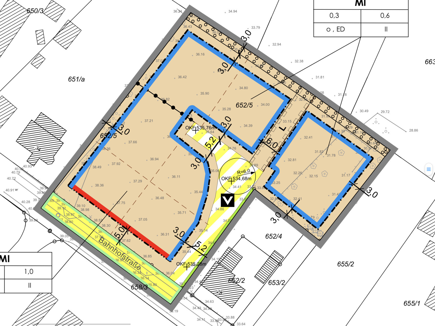 Bebauungsplan Und Parzellierung mit Maßen sind angehängt. Daraus sind auch die Höhenangaben ablesbar. ein Foto aus Süd-Ost-Richtung zeigt die Nachbarbebauung inkl. des toll aufgeschütteten Grundstückes.