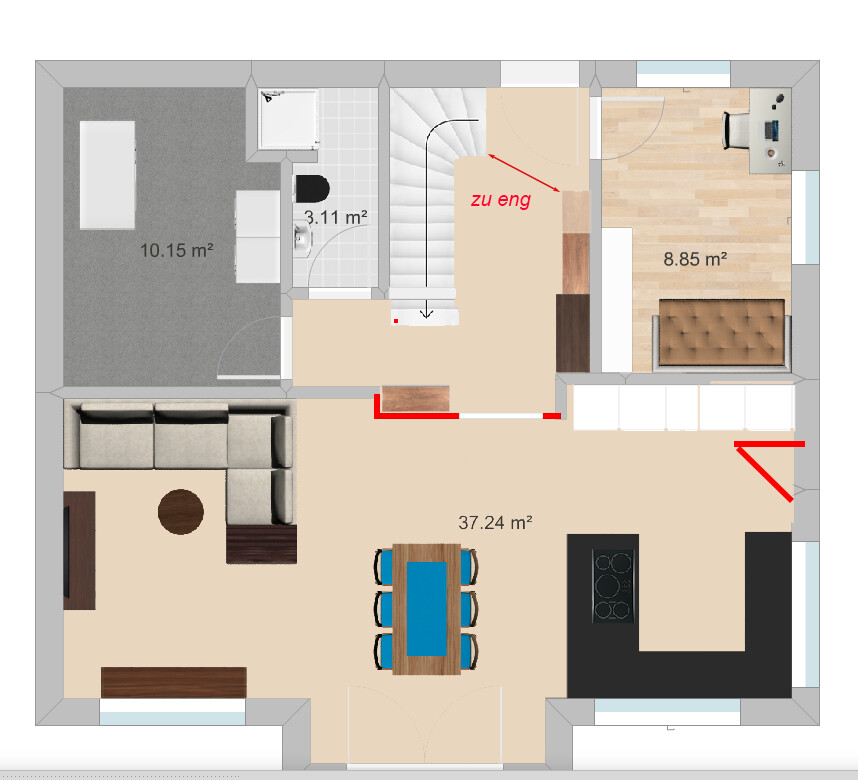 Was nebenbei noch so auffällt: die Speisekammer muss weg - sagte Yvonne schon - die ist gaga. Zudem würde ich die Treppe offen lassen, der Flur wirkt so schon viel zu eng. Garderobe etwas kleiner - eventuell den Rest unter Treppe, falls da kein Keller ist. Küche etwas schmaler, damit man im Flur nicht ständig gegen Kanten und Ecken läuft und mehr Platz am esstisch ist.