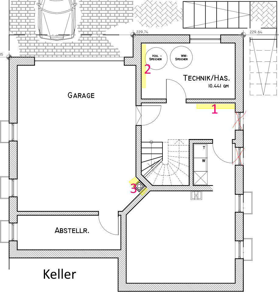 Sowohl für die Kontrollierte-Wohnraumlüftung als auch die zig Kabel für die KNX Steuerung ist eine Wegführung in unseren Technikraum im Untergeschoss (Keller) notwendig.