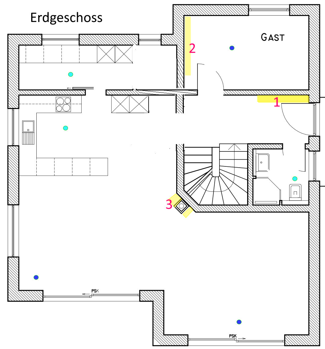 Ich habe das EG einmal "aufgeräumt", da ich den sittlichen Nährwert der Schrägwände und der "lichtdurchfluteten Schmutzecke" zwischen Gast und Speisekammer nicht sehe. Die Steigstränge für Lüftungskram und für Automatisierungskram in einem Strang zu bündeln, ist m.E. eher kontraproduktiv als (wofür ?) vorteilhaft und würde wohl bedeuten, zwischen den Punkten "2" und "3" etwa in einem Querschnitt von 30/20 einen Kasten unter der Decke herzuziehen. Der beste Punkt wäre wohl nahe bei "1", allerdings technikraumseitig der Wand zur Diele. Über der Decke des EG sehe ich die Lüftungskanäle dann in Richtung "Raum über dem WC" und in Richtung "Raum über der Speisekammer" vorstoßen, während sich die Automatisierung und weitere Elektrik jeweils unter den Decken auf "3" zumarschiert.