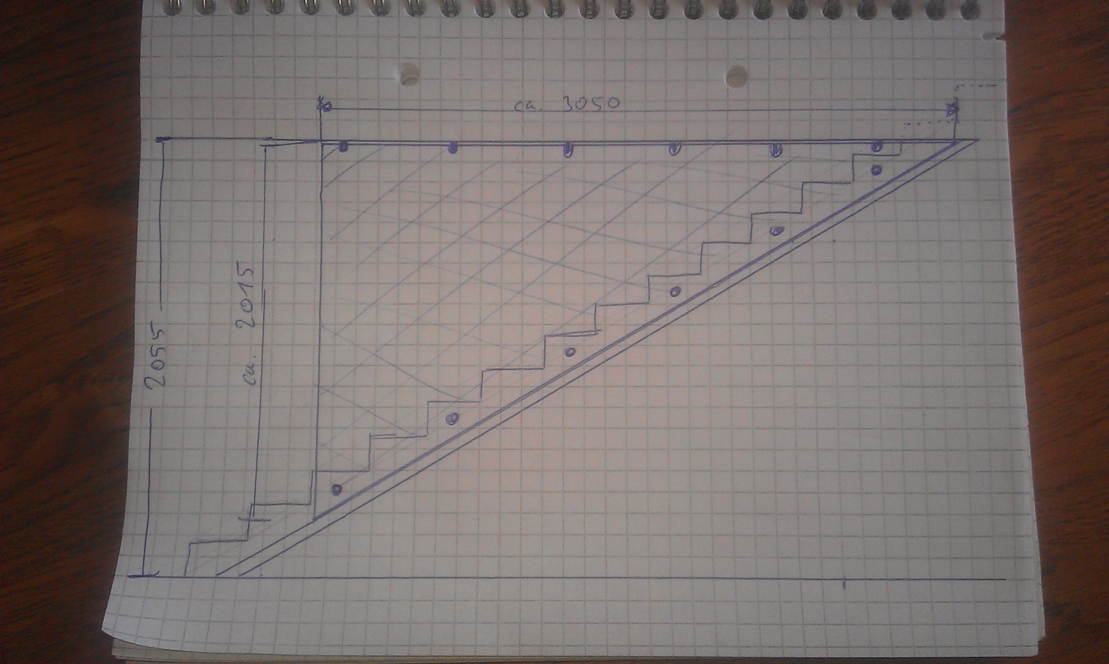 Handgezeichnete Skizze eines Treppenabschnitts in einem Dreieck auf kariertem Papier.