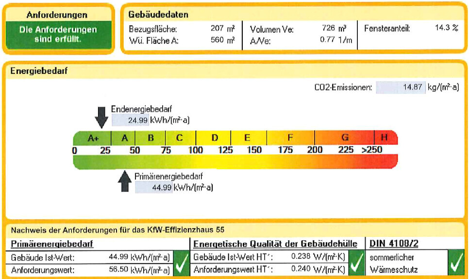 Noch nicht Weltklasse, aber dem Ziel etwas näher. Laut Statiker können sich die Werte noch etwas verbessern, wenn die konkreten Fabrikate/Modelle der Heizung & Lüftung eingegeben werden (die stehen aktuell noch nicht zu 100% fest).