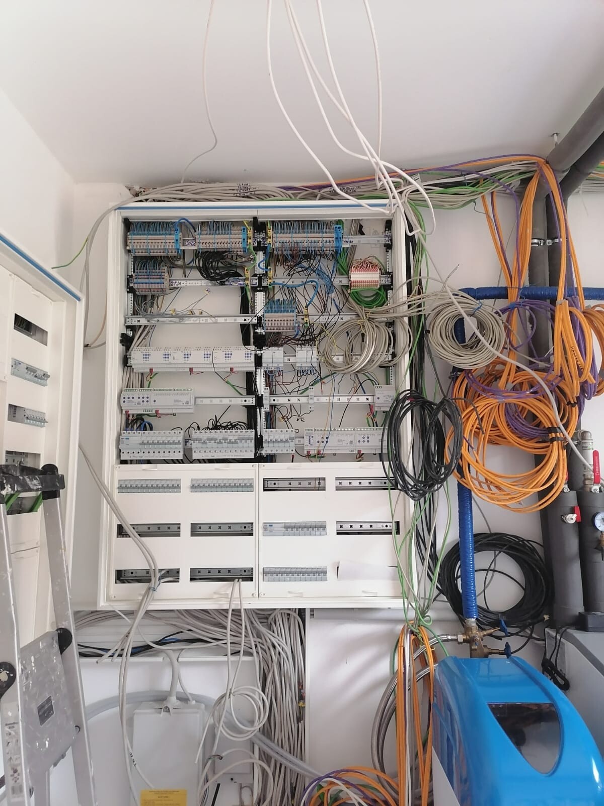 Elektrischer Schaltschrank mit vielen Kabeln, Verteilerleisten und einer blauen Maschine rechts.