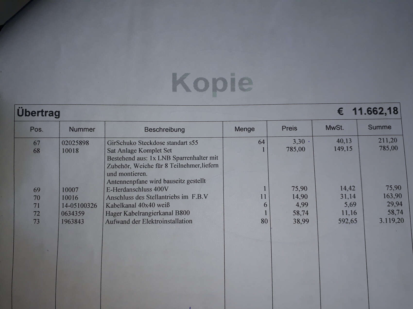 wollte euch von einem Update berichten, der Elektriker hat mir die Auflistung geschickt.