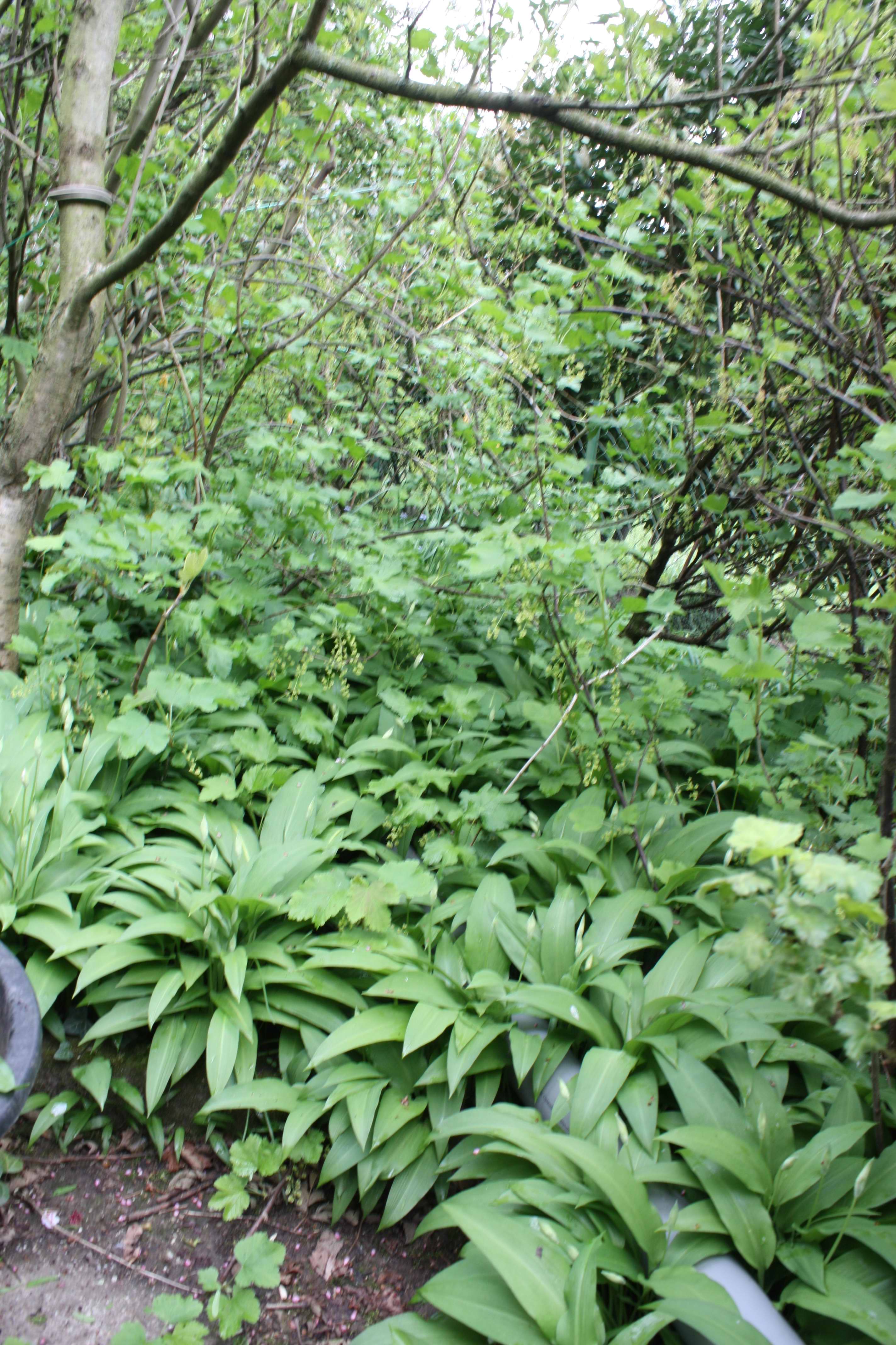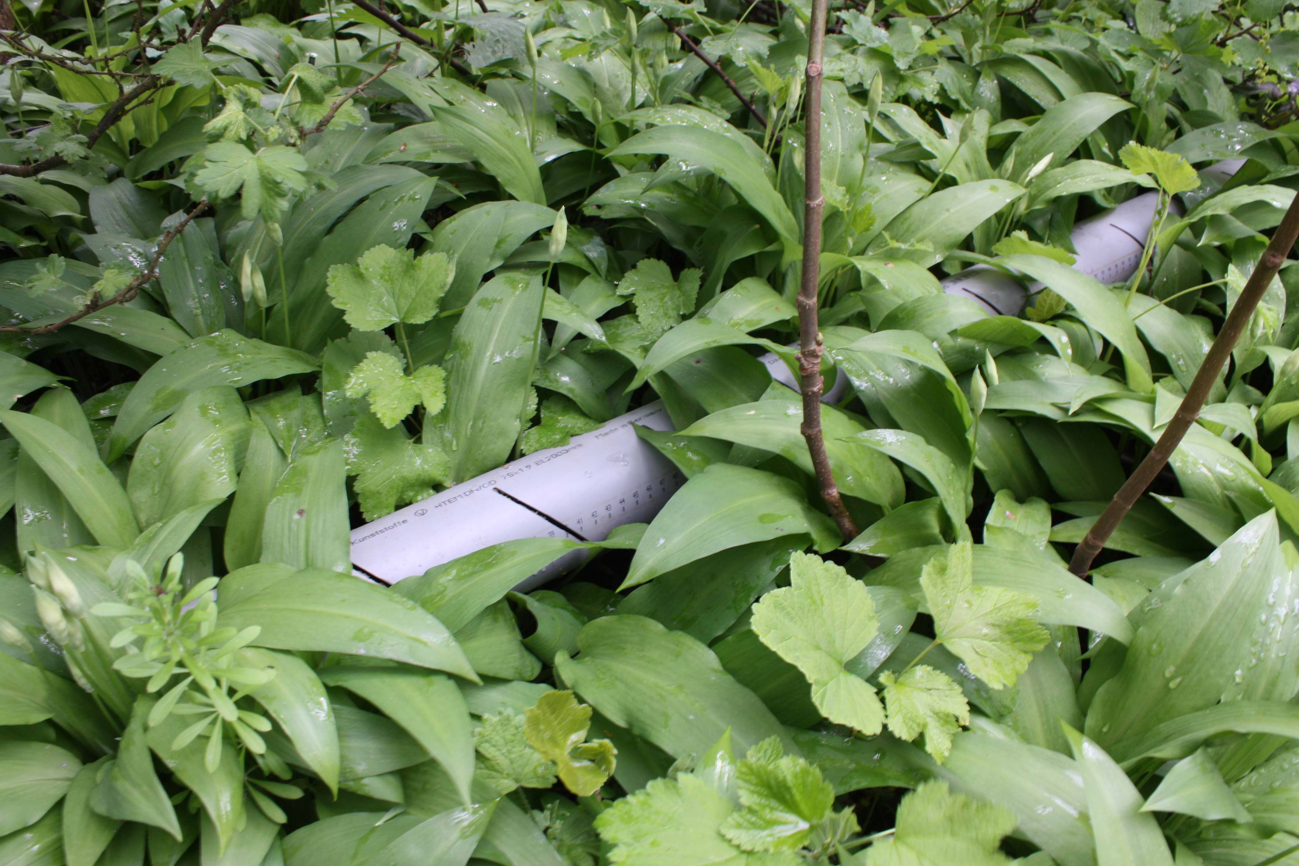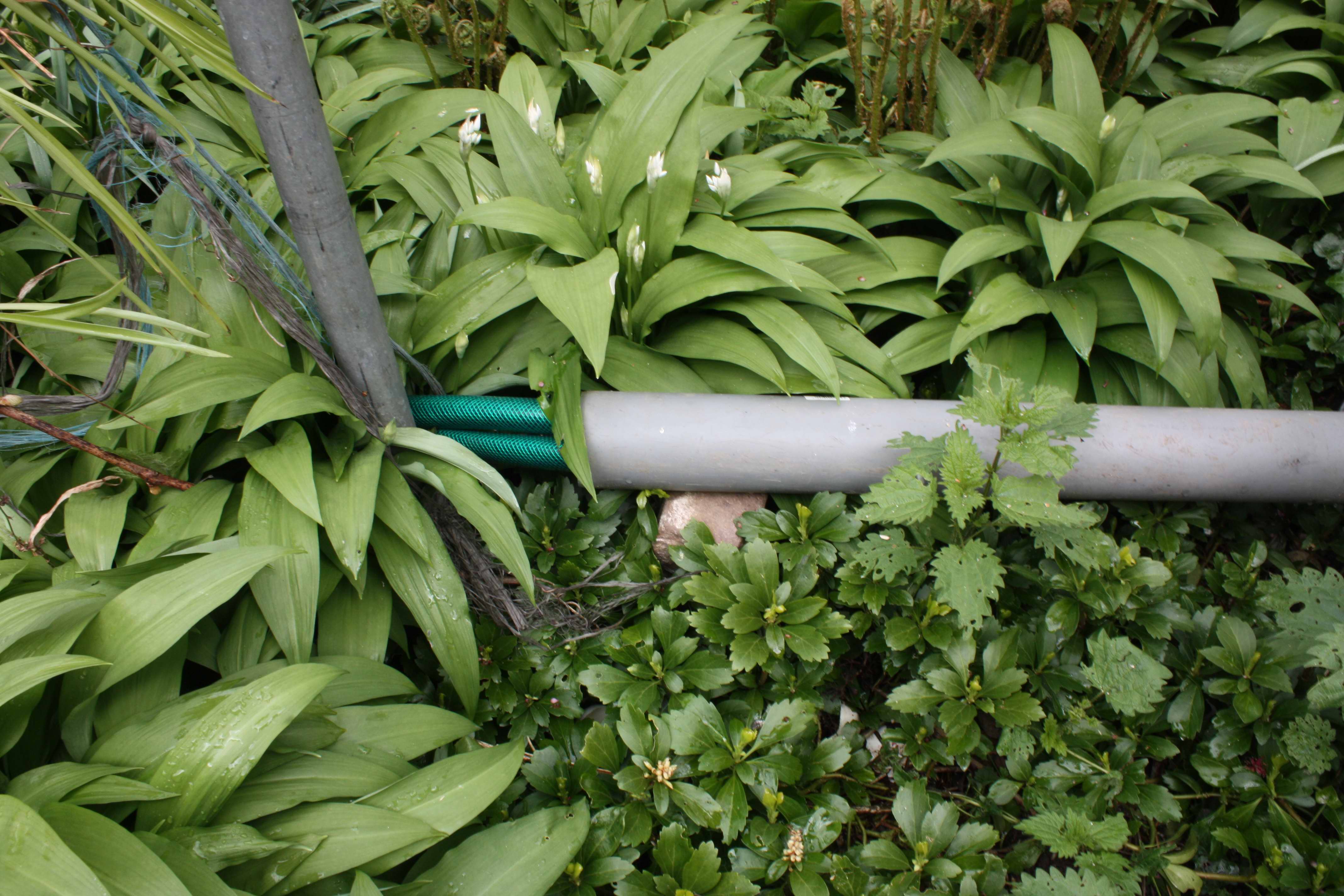 Dieses Rohr liegt Oberirdisch im Garten. Dieses habe ich einseitig mit einer Kreissäge geschlitzt (Bild 3). Die einzelnen 2m Stücke habe ich dann ohne die Abdichtungsgummis zusammengesteckt so das man die einzelnen Stücke leicht verdrehen kann wodurch man gewissermaßen einstellen kann welche menge an Wasser wo austreten soll. Da dieses Rohr sich auf einer Fläche befindet wo Bärlauch steht sieht man diese Leitung zur Zeit nicht bzw. kaum wie man auf den Bildern 3 und 4 sieht. Soll bedeuten das man durch geschickte Bepflanzung diese Rohre verstecken kann.