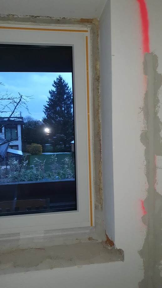 Die Fenster wurden an die Außenkante der Wand gesetzt, Außen wurde ein schwarzes Klebeband über die Faschen geklebt und innen wurde die Fuge zwischen Fenster und Außenputz mit Schaum ausgefüllt und unten noch ein weißes Klebeband geklebt.