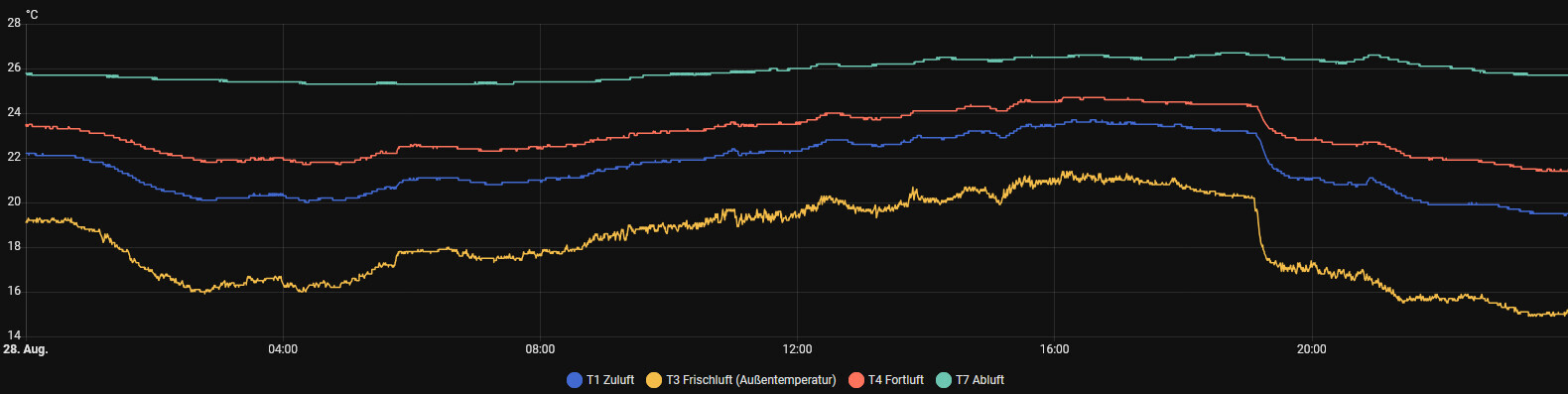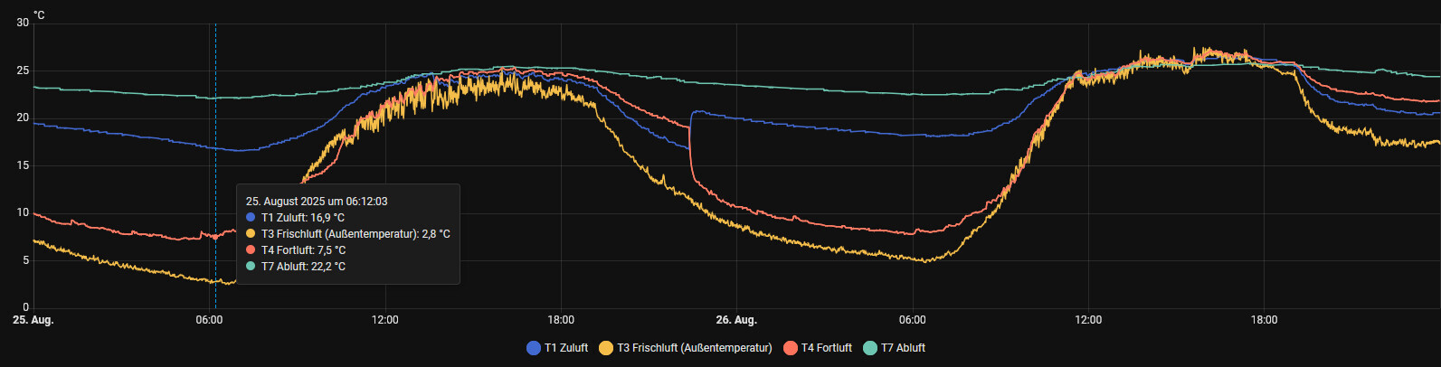 Heute morgen um 7 Uhr hatte ich eine Frischlufttemperatur von 17,7 °C - die Zulufttemperatur beträgt jedoch 24,4 °C.