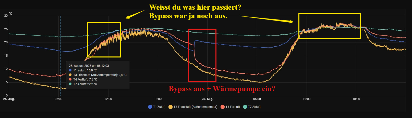 Man sieht hier ziemlich gut, wie sich die Temperaturen ändern, wenn der Bypass ausgeht (0) und damit der Wärmetauscher arbeitet.