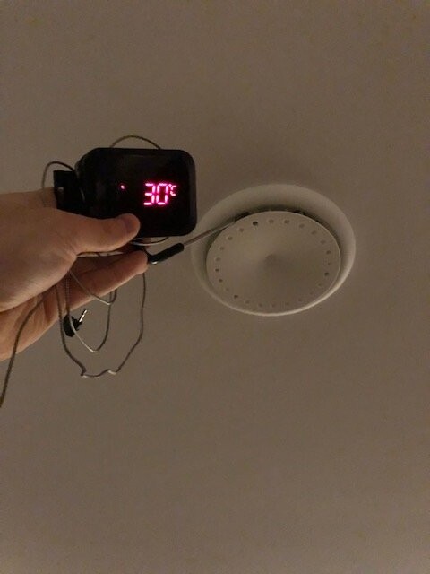 Hand hält ein digitales Thermometer mit roter Anzeige (30°) vor einem Deckenrauchmelder.