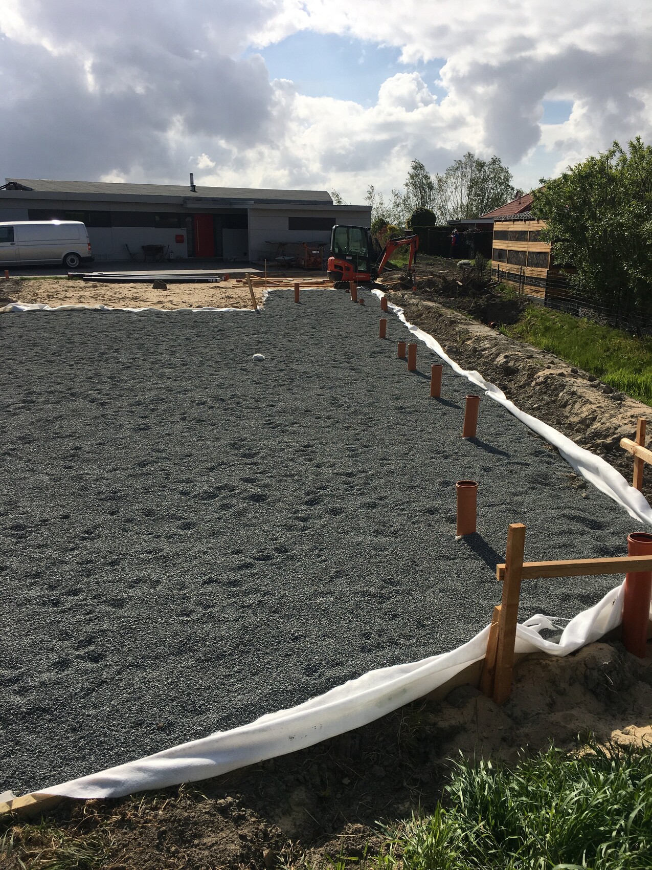 Der Unterbau ist eine Sandplatte, darauf eine Trennlage, 30 cm Kies 16/32, Trennlage und Splitt.