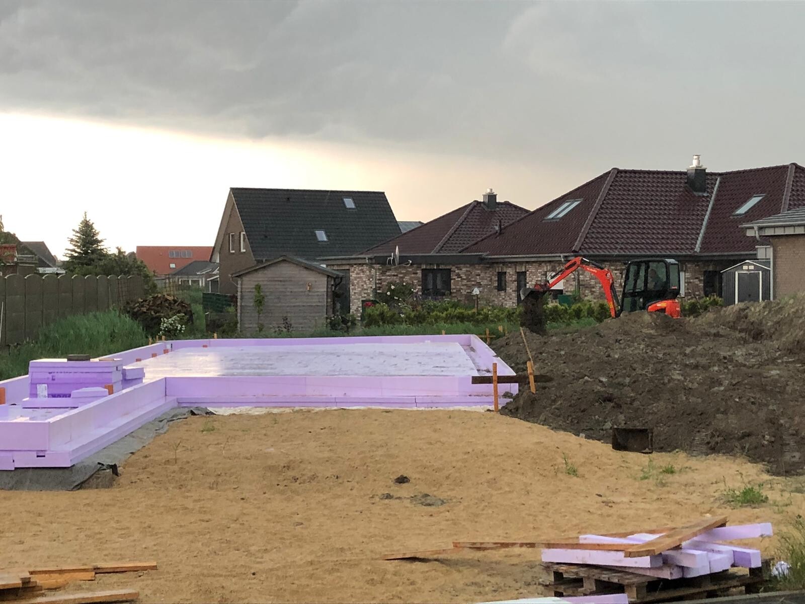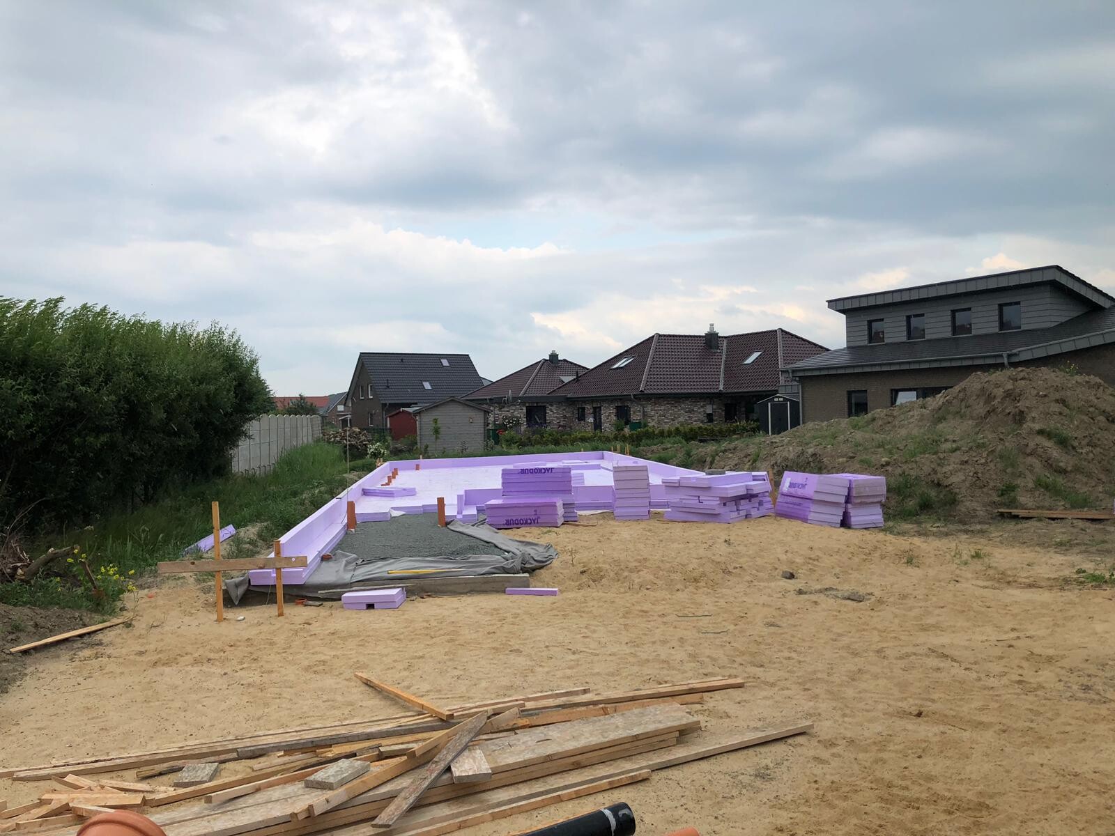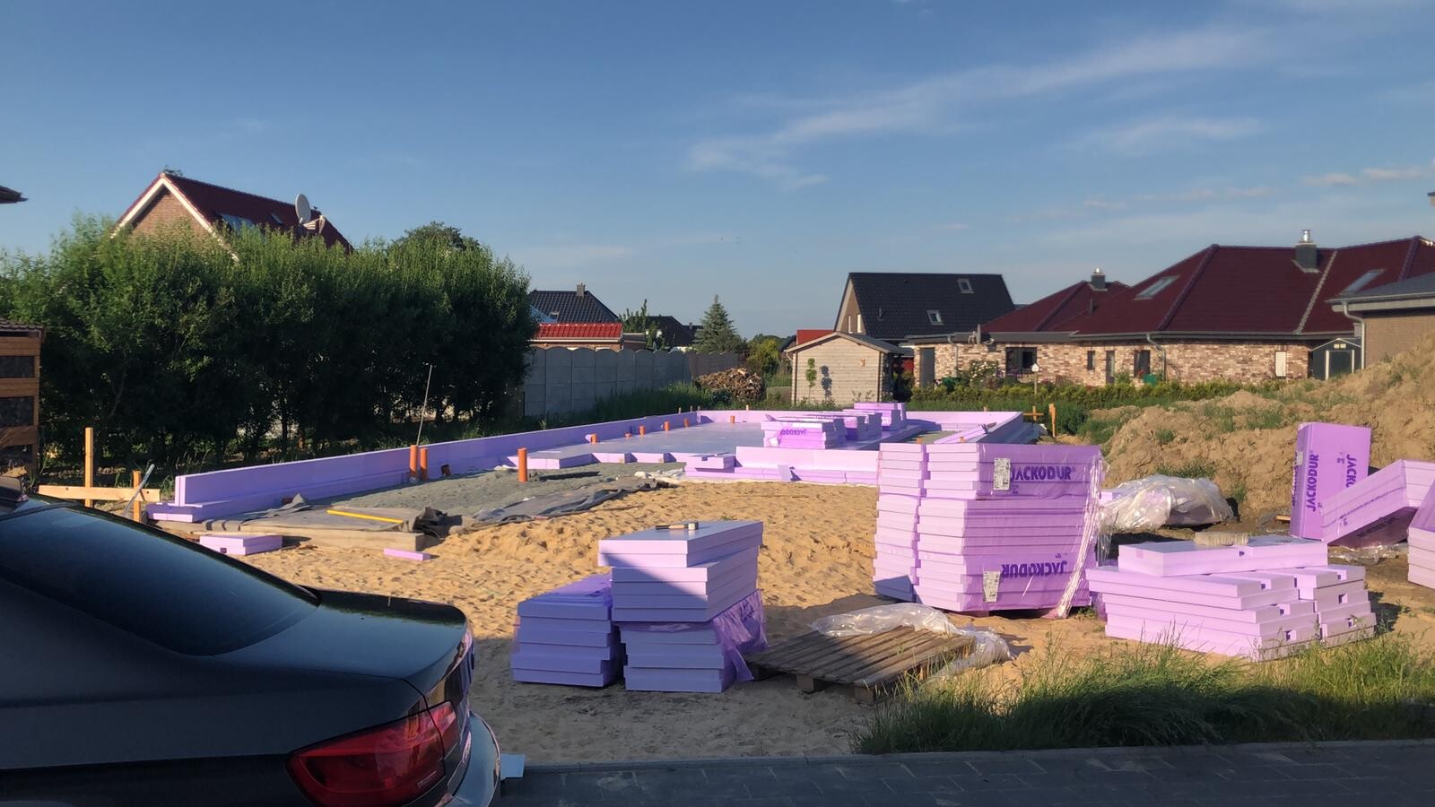 Streifenfundament, Schalung und Dämmung für die Garage sowie Dämmschalung für Haus u Technik sind nun auch fertig.