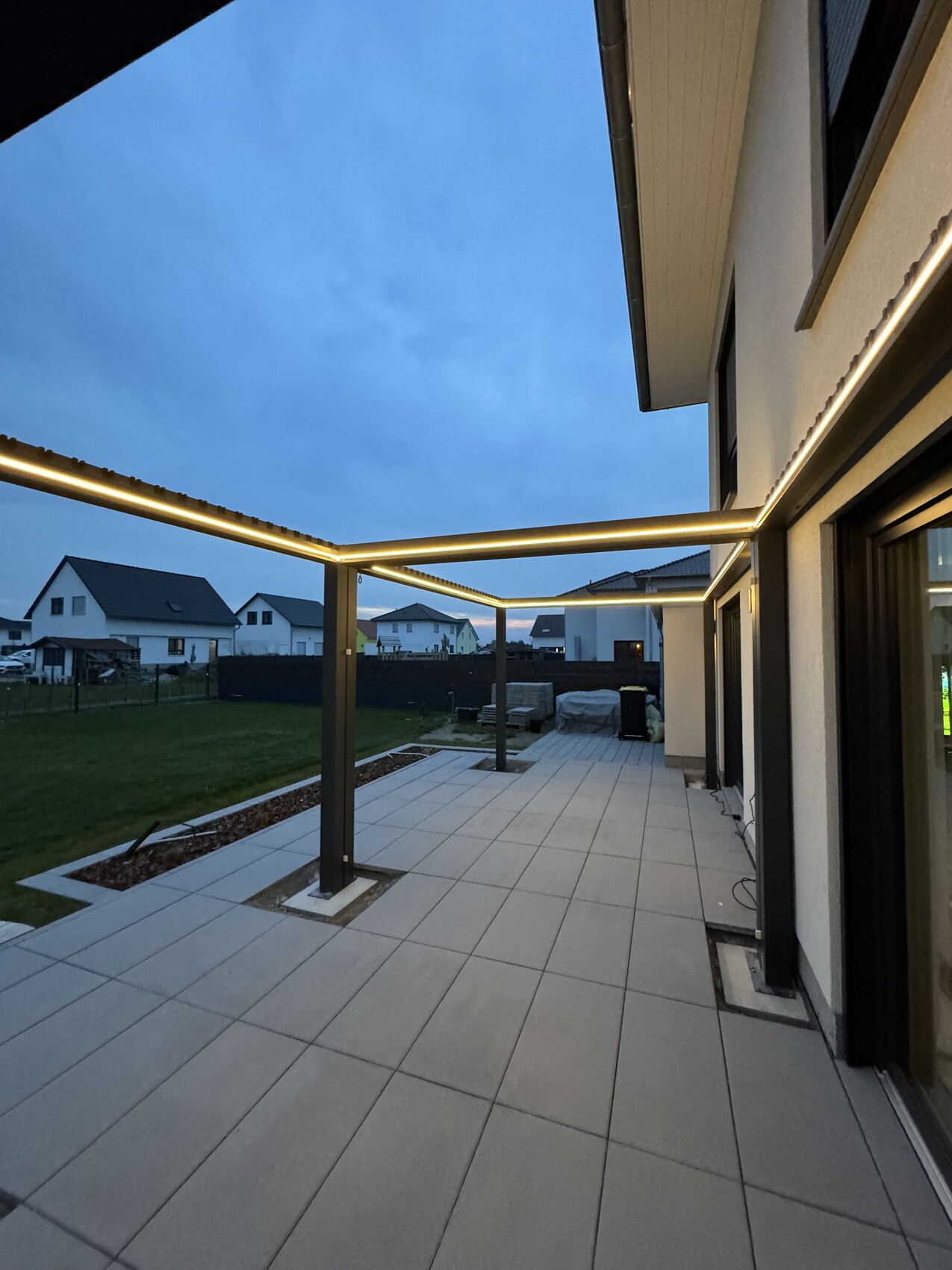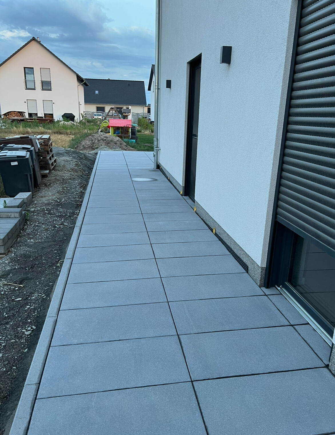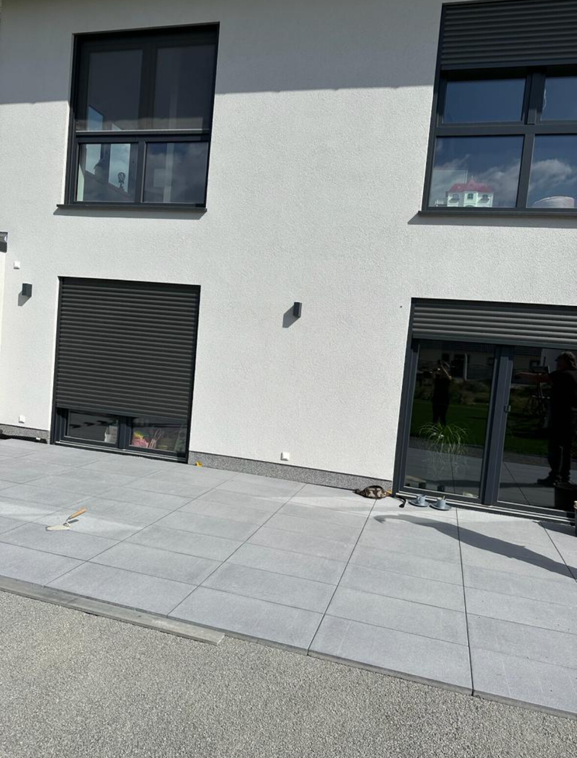 Danke für die Bilder. Habt ihr unter den Platten vor den Türen eine Dämmung (XPS) in die Laibung gesetzt? Spritzt es euch nicht ständig die Glasscheiben mit Schmutz voll wenn es regnet?