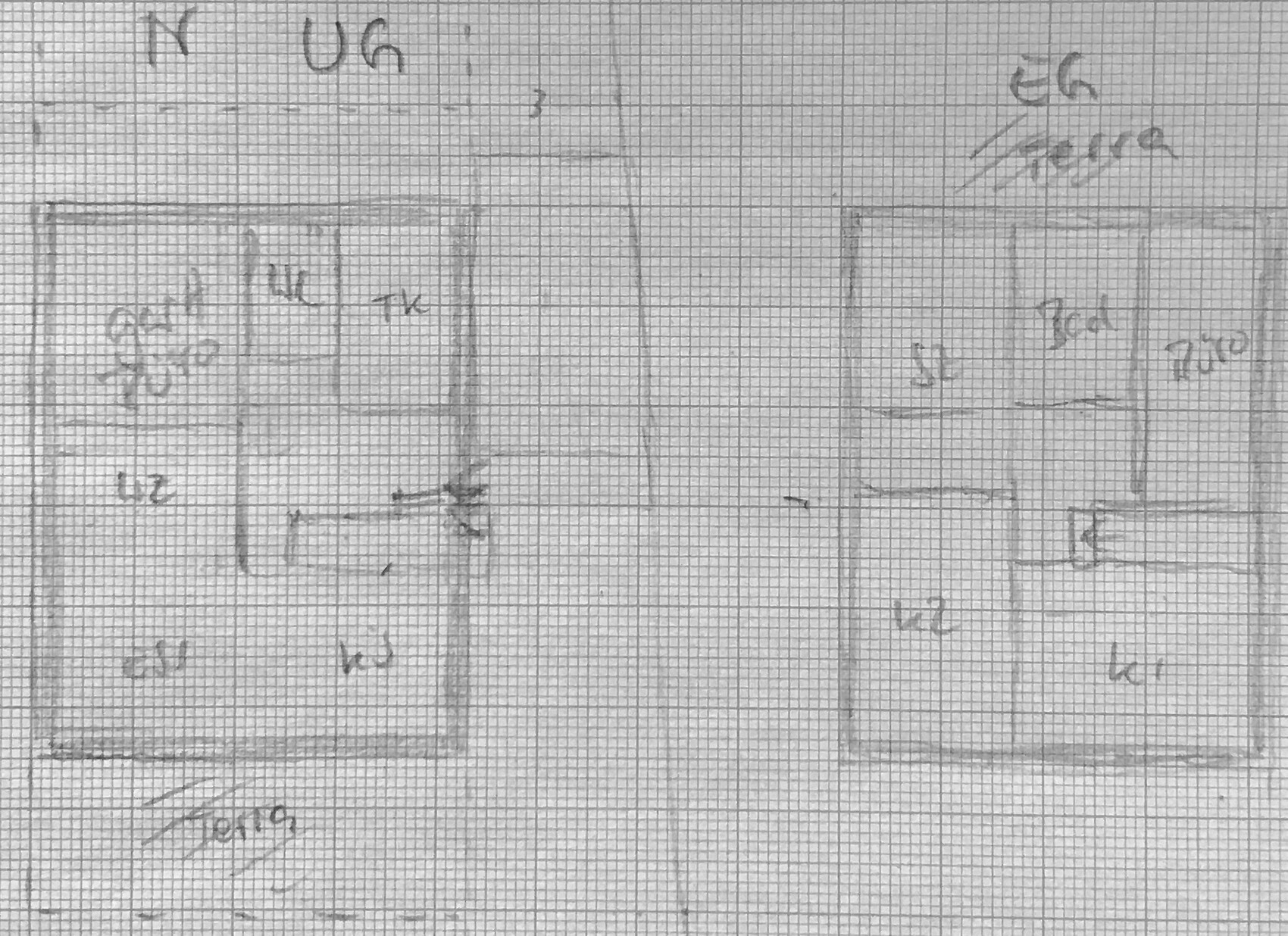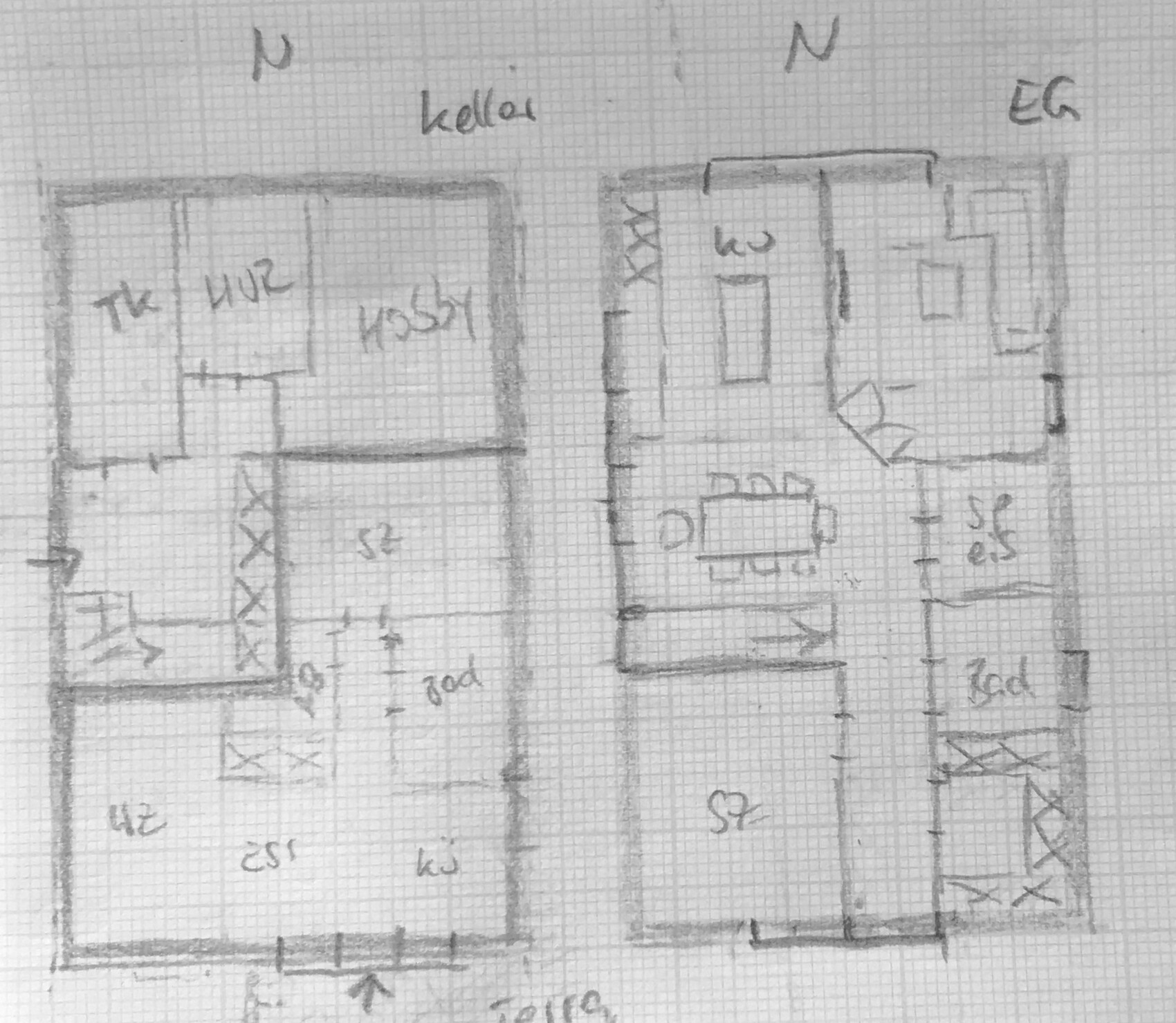 Eingang und WoEsKü im UG mit Südterrasse, im OG die gängigen Schlafzimmer mit Möglichkeit einer Norterrasse. Meine Skizze erscheint etwas klein mit 10 x 8,5, es wäre auch kein Platz für Abstellräume. Insofern größer machen zb nach hinten.
