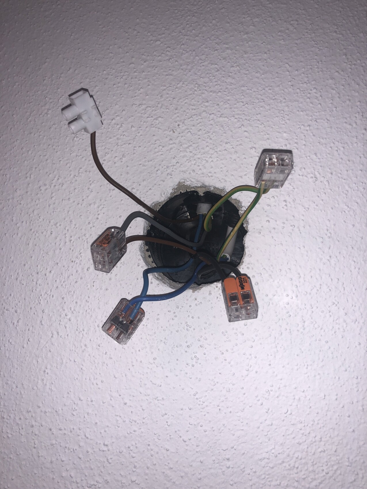 Deckenrosette: offenes Kabelgewirr mit braunen, blauen und grün-gelben Leitungen sowie Steckverbindern.