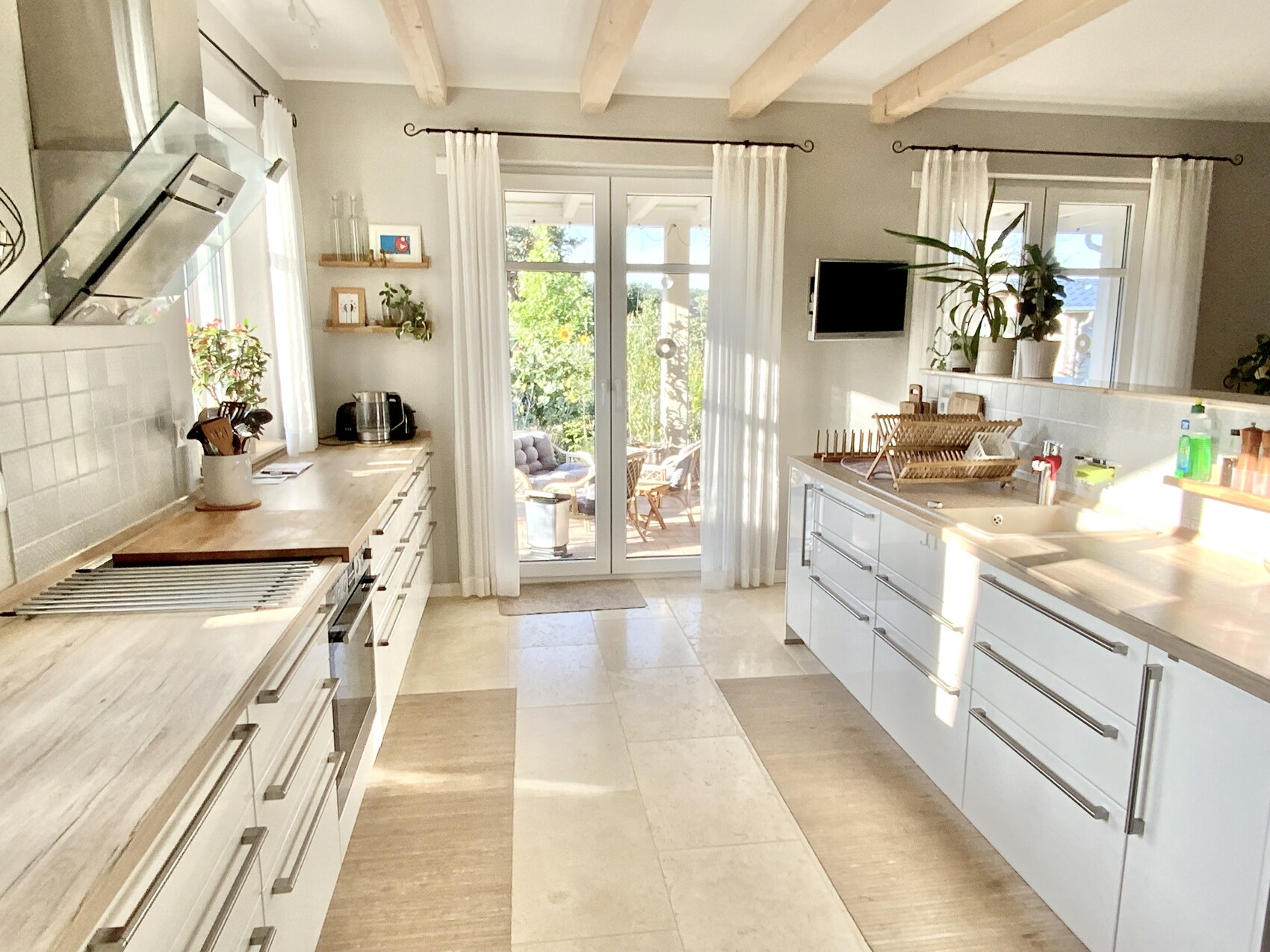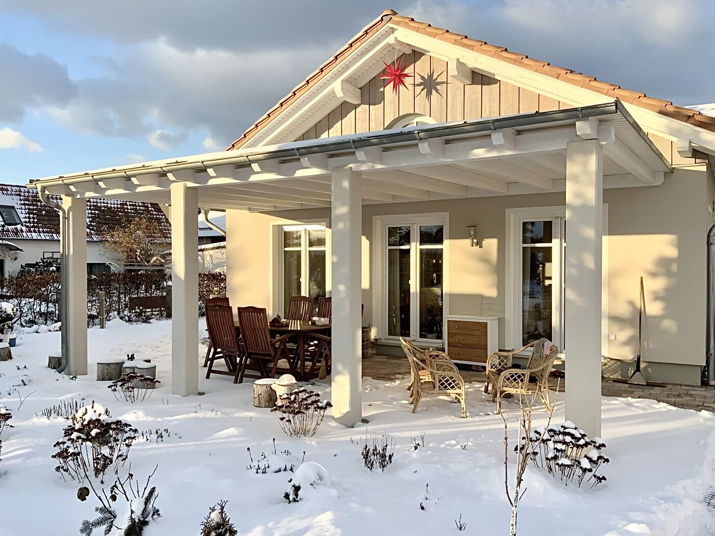 Wir haben eine überdachte Süd-Terrasse mit den Abmaßen 8 Meter breit und 4 Meter tief! Die lichte Höhe vorne an den Säulen beträgt 2,65 Meter. Wir fühlen uns mit dieser Überdachung viel wohler als vorher ohne.. Die Räume sind auf alle Fälle hell genug… noch nie hat jemand bemängelt, es wäre zu dunkel. Die Wintersonne steht so niedrig, dass sie bis tief in den Raum scheint. Im Sommer ist der Effekt sowieso unumstritten. Wir haben sogar unsere Jalousien entfernt, weil sie einfach nicht mehr nötig sind. Ob ihr den Balkon wollt, ist dann eure Entscheidung. Hier ein paar Eindrücke zur Lichtsituation..
