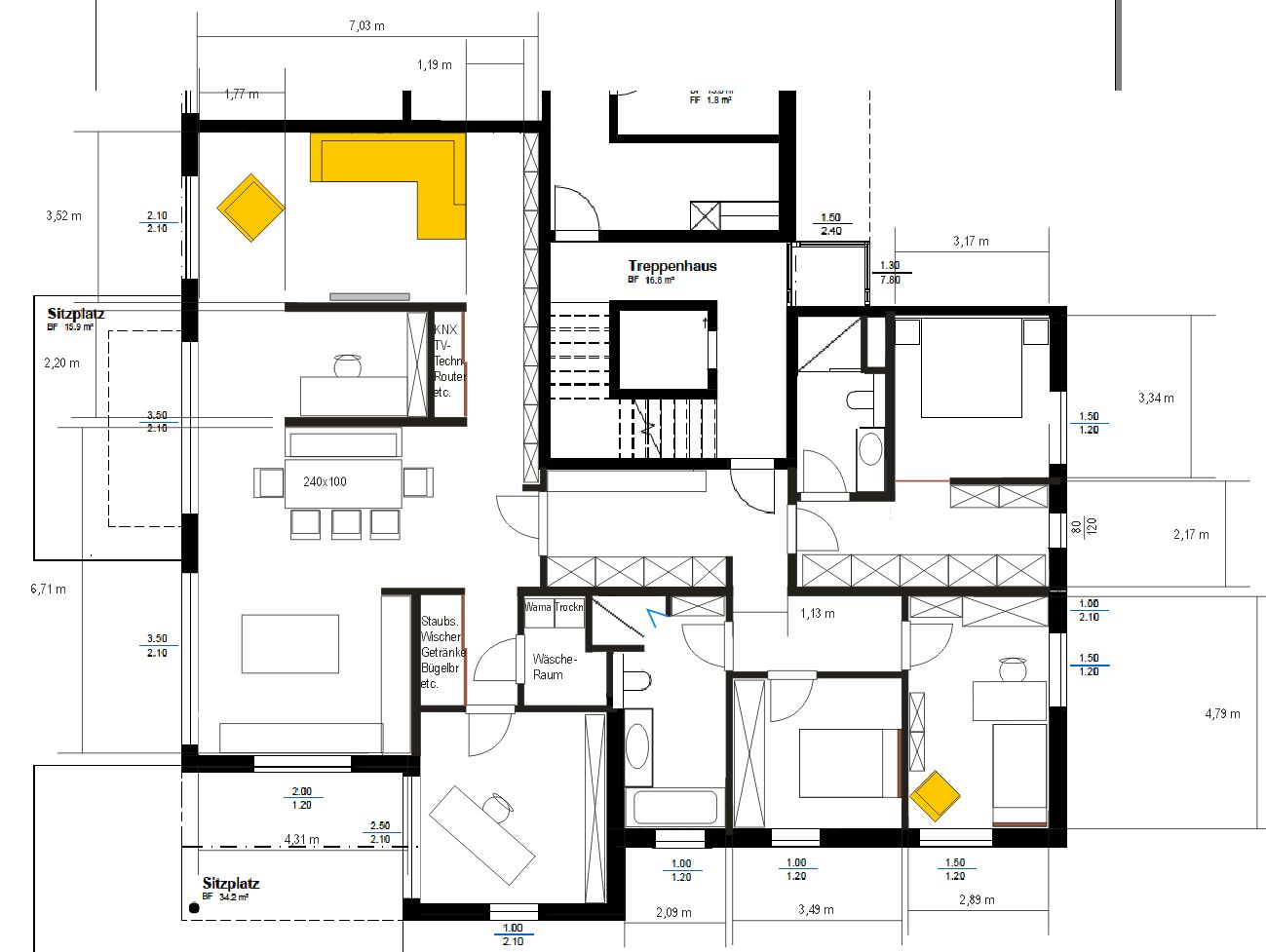 - Essplatz jetzt eingezeichnet mit Tisch 240x100, Stühlen mit Maß 60x60 cm und gemütlicher Sitzbank, Esstischsofa oder ähnlichem