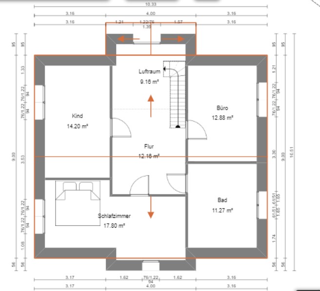 Grundriss anbei. Aus den von dir genannten Gründen, ypg, haben wir uns größtenteils an den Entwurf eines GU gehalten und nur angepasst. Die ausgerechneten Zimmergrößen darf man natürlich nicht für bare Münze nehmen, weil die Schnell-mal-hingeworfen-Plattform die Dachschrägen nicht berücksichtigt. Ich bin nicht so meisterlich im Zeichnen, aber ich denke, ihr versteht das Prinzip und ein Profi würde es dann natürlich auf "Realtauglichkeit" überprüfen. Fenster und Türen sind auch erstmal sehr grob markiert.