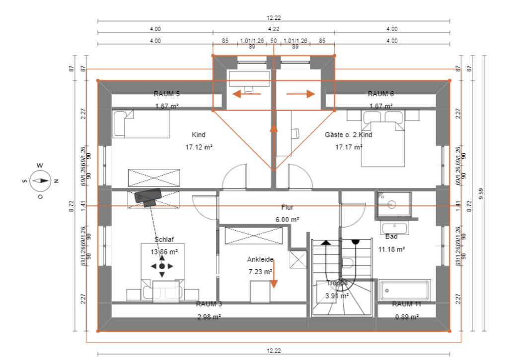 Ankleide durch Schlafzimmer unlogisch. Die Tür liegt da knapp an der 2-Meter-Linie.
