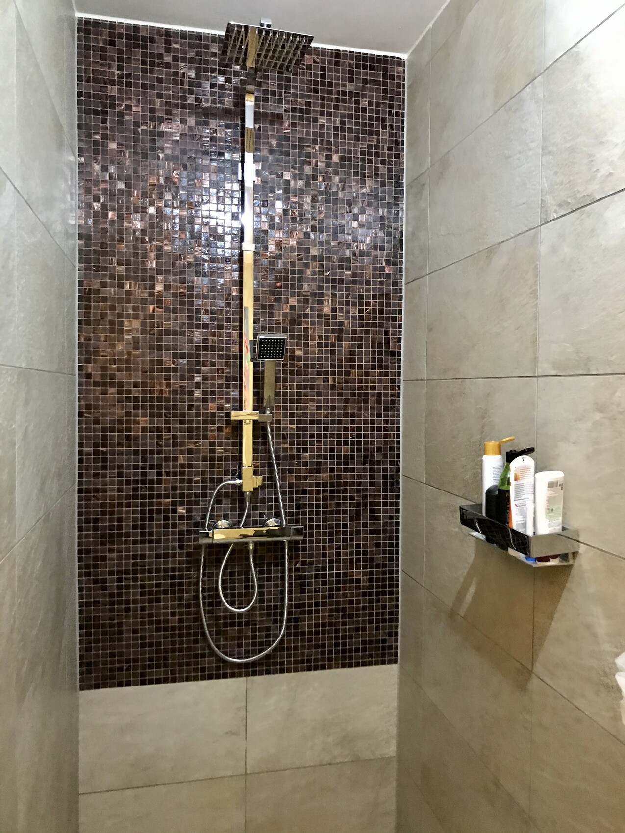 Dusche mit braunen Mosaikfliesen, Regenduschkopf, Handbrause und Regal mit Pflegeprodukten