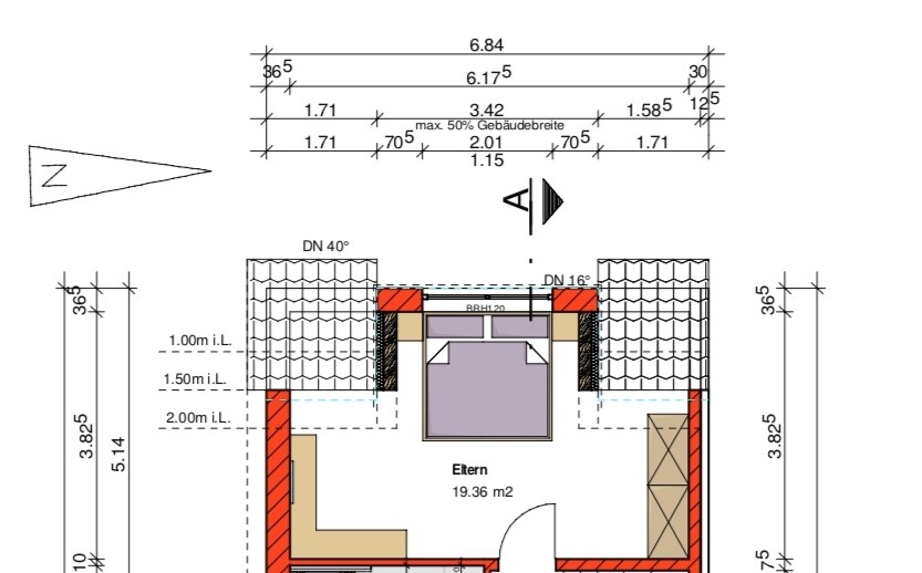 Grundriss eines Elternschlafzimmers mit Möbeln, Türen und Maßlinien