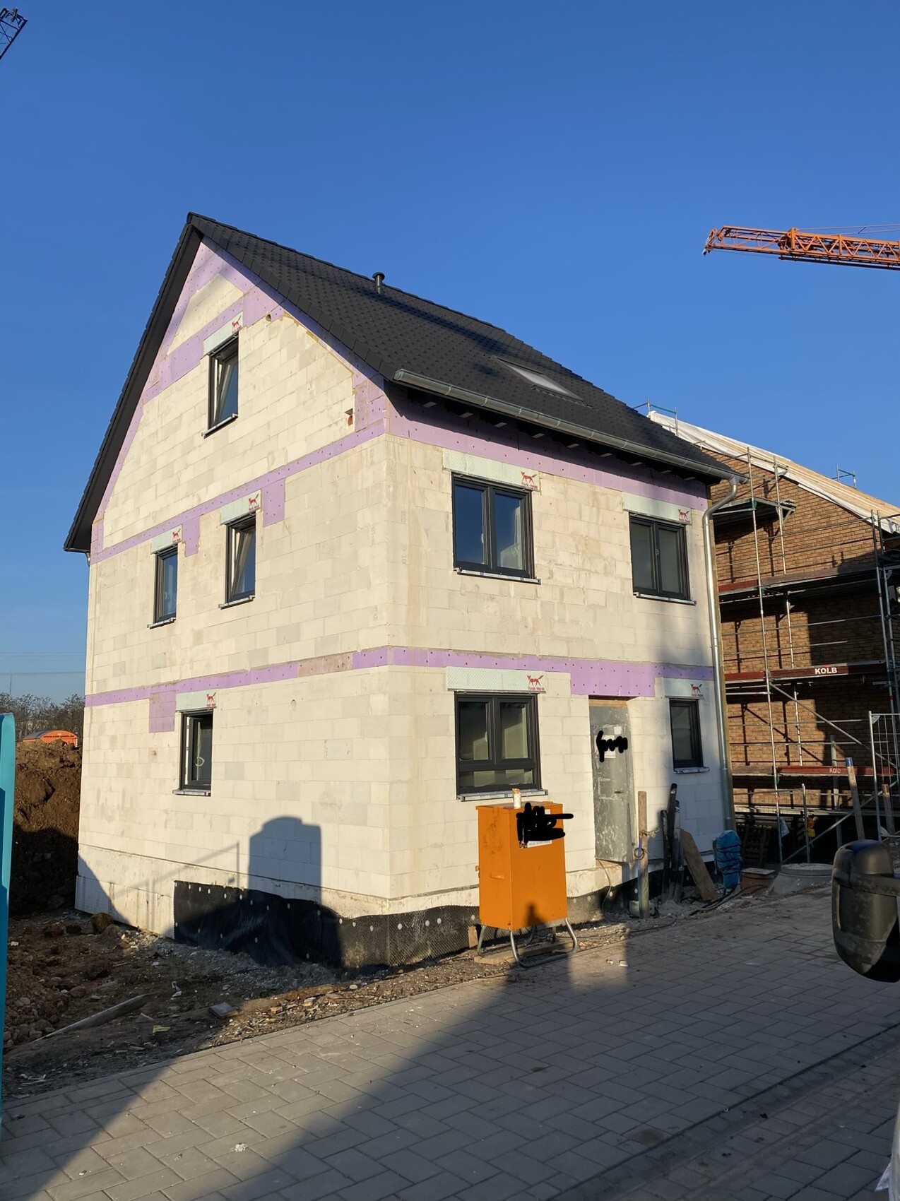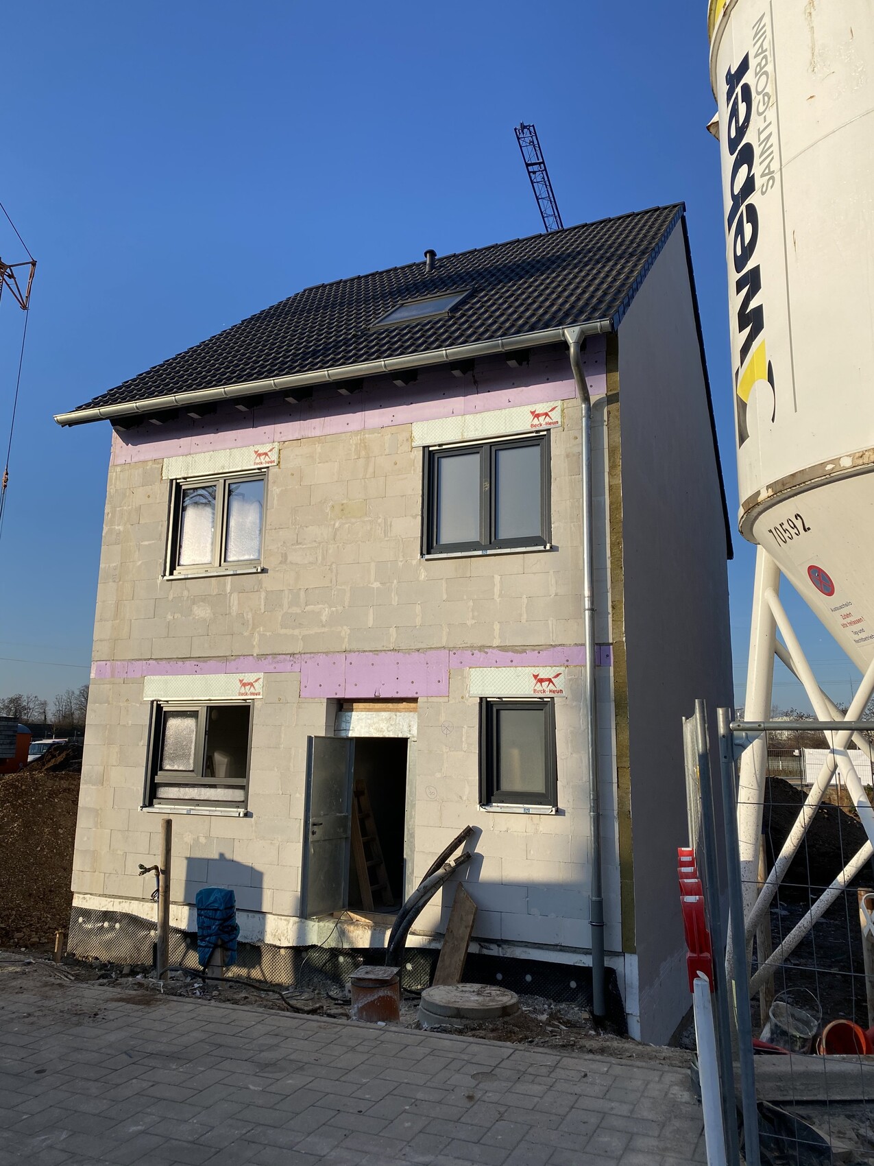Der Viebrockhaus-Hausbauer verklinkert sein Haus komplett auch zum Mittelhaus hin? Der Mittelhaus-Bauer hat immer noch nicht angefangen?Genau - auch wir haben unsere Trennwand komplett gedämmt, da wir zum damaligen Zeitpunkt nicht einmal ein verkauftes Mittelhausgrundstück hatten. Außerdem muss das Mittelhaus später eh deutlich weiter nach hinten rutschen wg. den Stellplätzen. Daher ging es nicht anders.