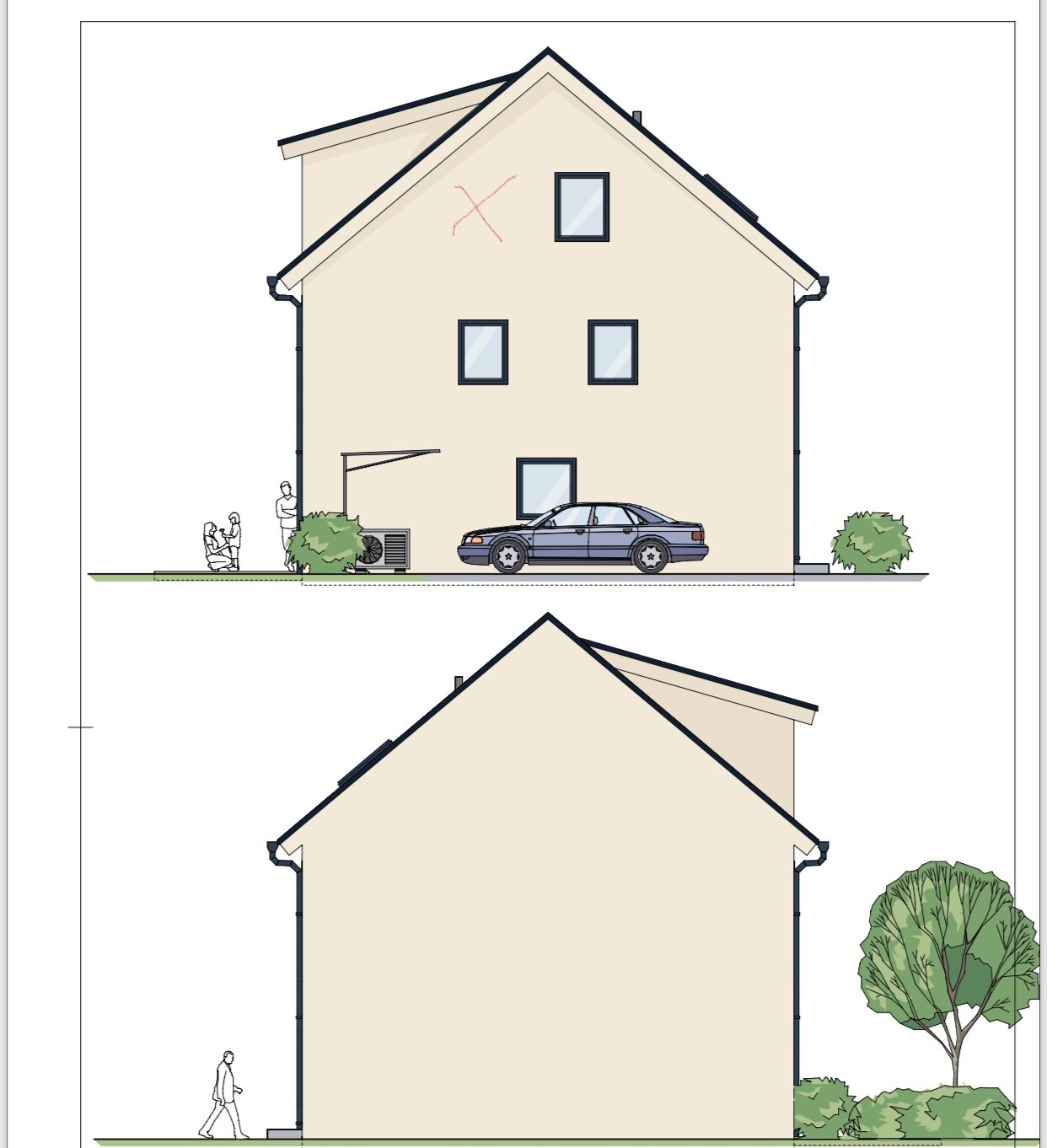 Zweistöckiges, beigefarbenes Haus mit Satteldach, blauem Auto, Garten und Menschen.