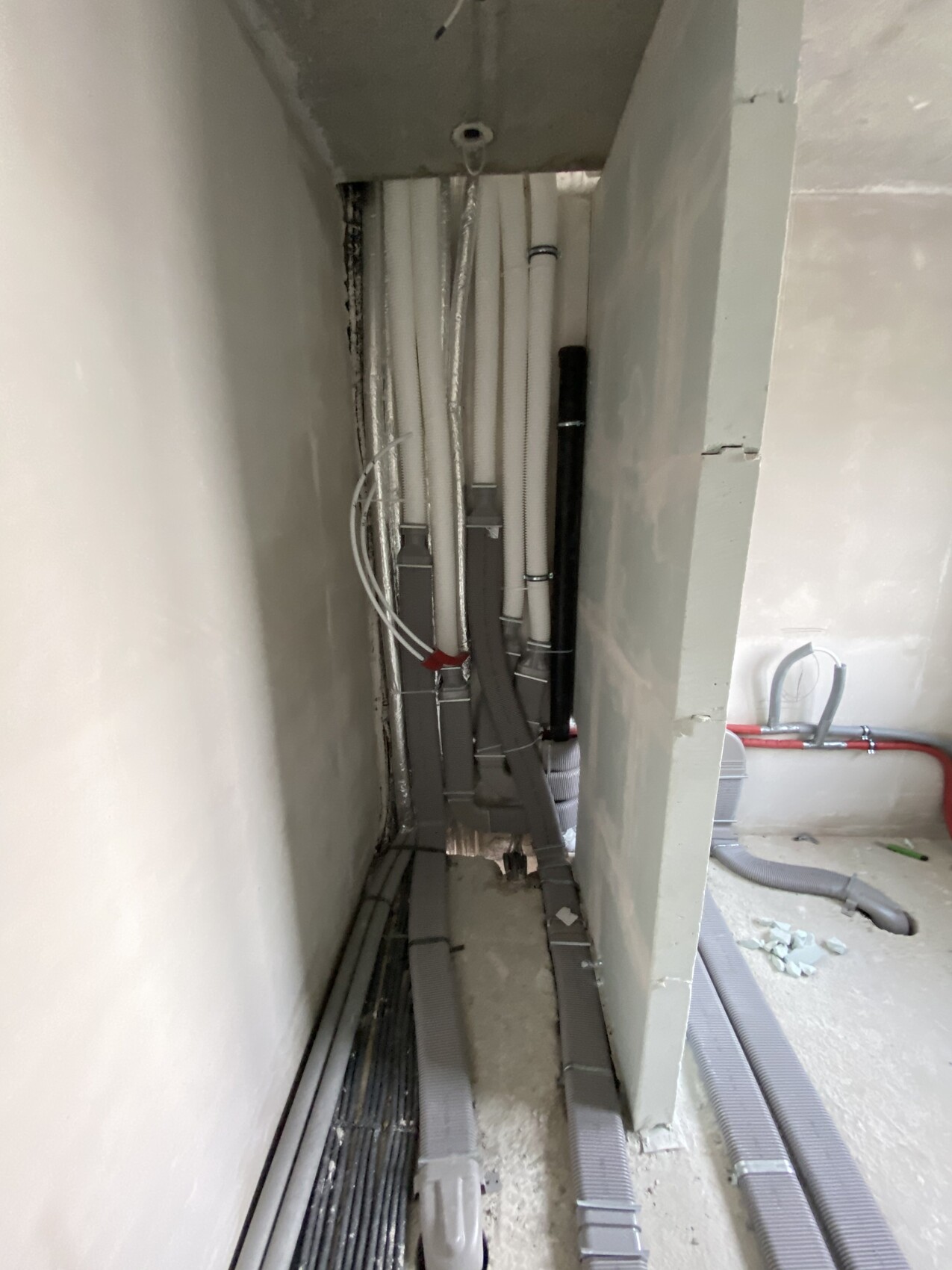 Die Problematik mit der Außeneinheit der Wärmepumpe ist auch einigermaßen geklärt: die Kältemittelleitung wurde gelegt und ist ca. 18,5m lang - Daikin sagt, dass bis zu 20m ok wären. Also kommt die Außeneinheit eben hinten in den Garten.