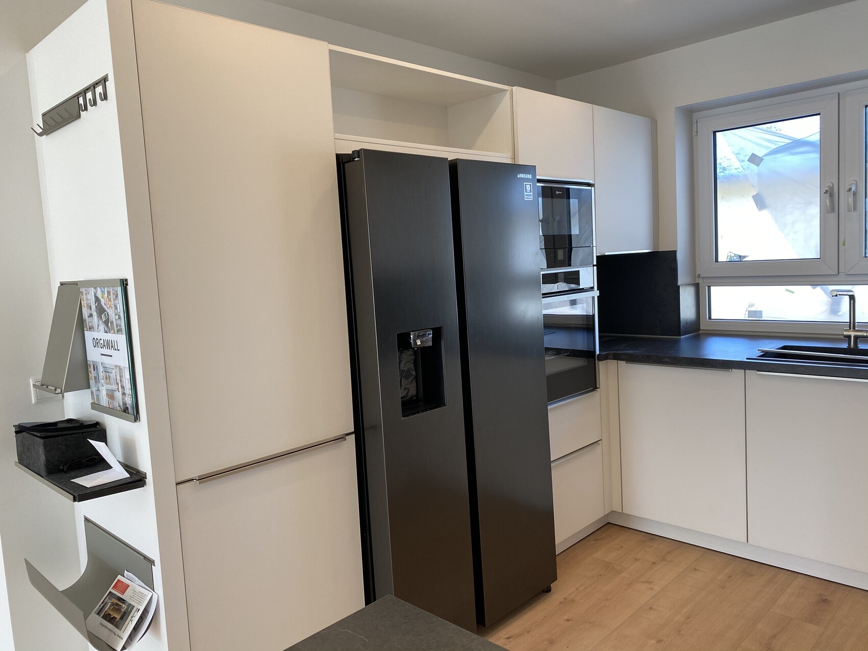 Sehr schöne Küche. Bis auf die herausragende Kühl-/Gefrierschrank-Kombi. Die find ich störend im Allgemeinbild. War das so geplant und gedacht oder ergab sich das so?Das ist ein Side-by-Side Kühlschrank mit einer Tiefe von ca. 72cm - die stehen immer so weit raus.