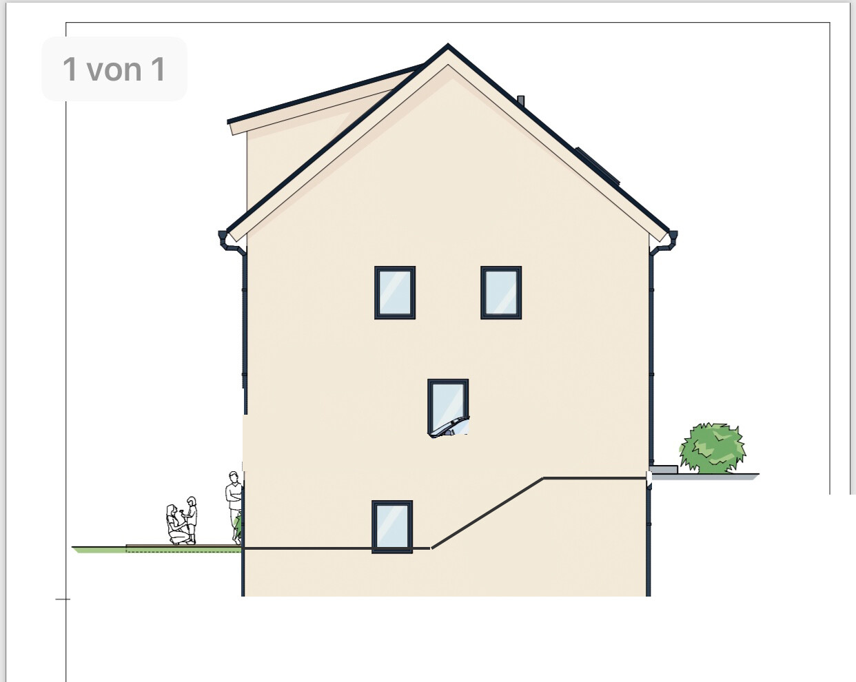 Deswegen würde ich bei den Einsfünfzig Terrainunterschied zwischen "gekauft wie besehen" und "Baubeginn" auch nicht im Traum daran denken, den Keller auf das jetzige unvertiefte Grundstück zu stellen, sondern selbstverständlich so einbuddeln, daß Oberkante Fertigfußboden EG auf dem neuen Plan-Null rauskommt. Denn nur so entspricht es effektiv der bisherigen Bodenplatten-Planung.Davon war ich jetzt auch ausgegangen. Im Grunde ist die Höhenlage jetzt etwa diese, oder?:Nur die Frage, wie man auf die Terrasse kommt. Entweder braucht man vom UG ne Treppe nach oben oder vom OG nach unten, wenn man das Gartenniveau unverändert lässt.