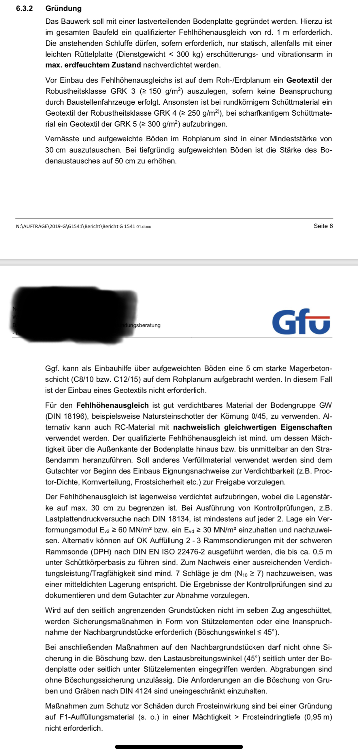 goalkeeper14.08.19 14:45Unser Bodengutachten ist da (siehe Anhang). Dort wird nun eine Aufschüttung empfohlen. Allerdings mit Stützelementen zum Nachbarn oder Böschung auf Nachbargrundstück.