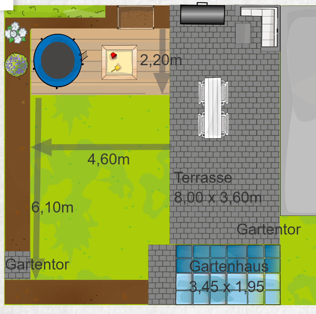 Zu den Maßen. Gartengesamtbreit 10m - Gartentiefe Ende Terrasse 6m. Tiefe Spielbereich inkl. dahinter liegendem Beet aus Variante 1 sind 3m Beettiefe ringsum 0,80m.