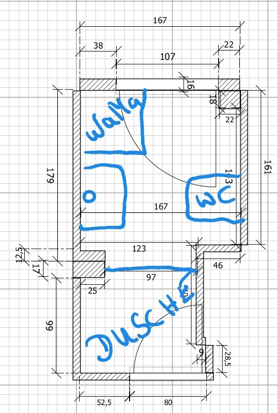 Ein Kompakt Stand WC ist immer noch nen halben Meter tief. Eine benutzbare Dusche sollt schon 70cm Breite haben. Ergo bleiben 37cm DurchgangAber bei 167 cm bleiben dann ja 47 cm vorm Klo. Das finde ich bei der Situation hinnehmbar. Von behindertengerecht oder Komfort ist das Bad so oder so weit entfernt...Noch eine GANZ verwegene Idee: Dusche in den Eingangsbereich. D.h. eine bodengleiche Dusche, die Eingangstür normal nach außen öffnen lassen und dann innen noch in den Rahmen eine Duschtür setzen. In die Engstelle dann auch eine Duschtür rein, die dann eben immer offen stehen. Ist eigentlich ziemlich bekloppt, aber so hätte man eine große Dusche, Platz beim WC, am Waschbecken und an der Waschmaschine. Das Fenster würde auch nicht stören.