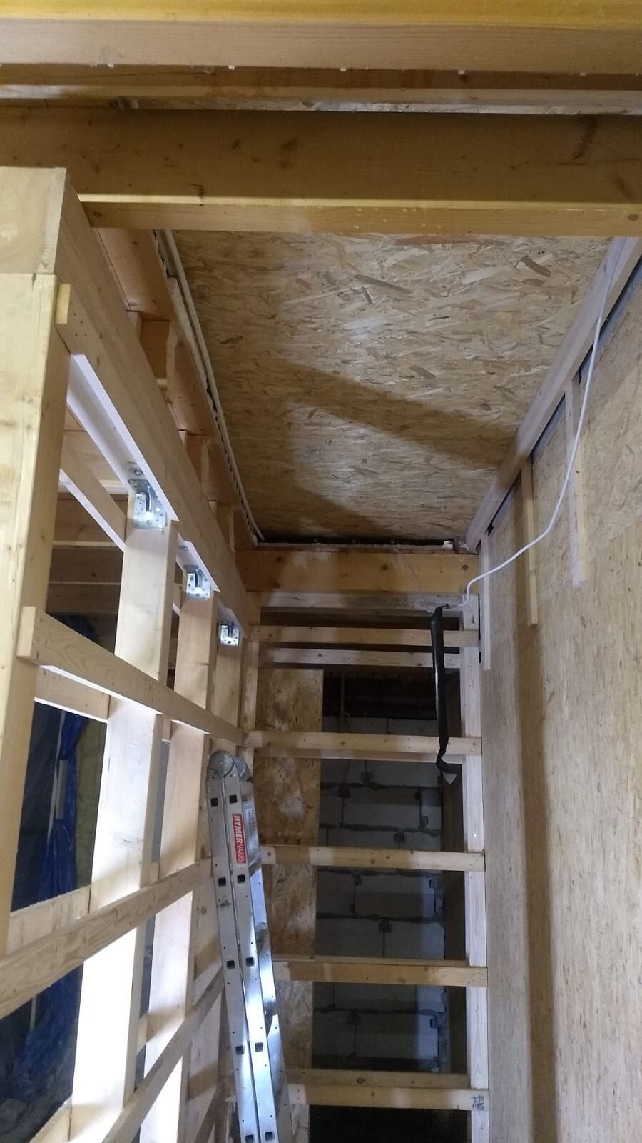 Rohbau-Sicht: Holzständerwerk, OSB-Decke, Leiter und sichtbare Elektroinstallation.