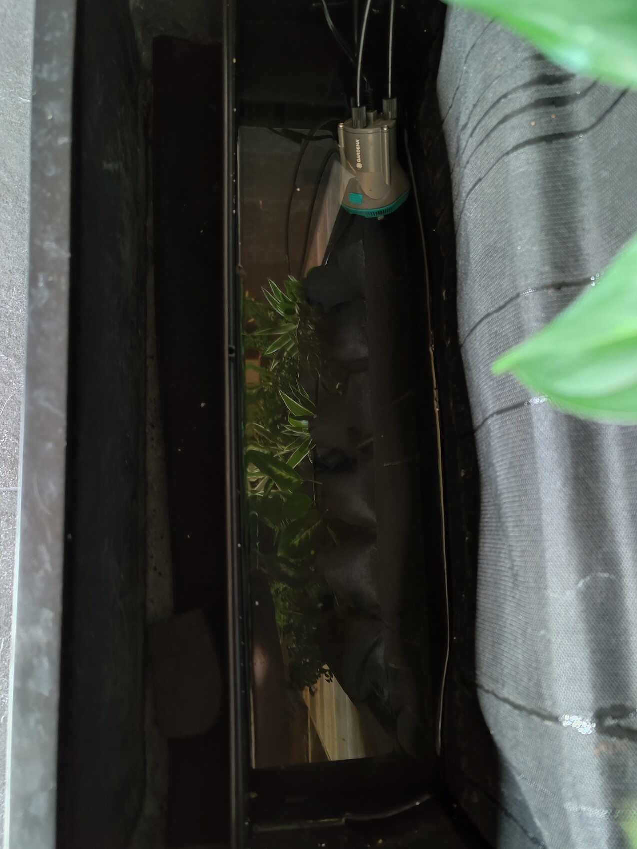 Die Bewässerung erfolgt automatisch über eine Gardena Bewässerung mit Timer. Die Pumpe liegt in der Plastikauffangwanne, in der ein gewisser Bodensatz an Wasser für die automatische Bewässerung vorrätig ist. Aktuell wird einmal täglich a 6 Minuten bewässert. 3 Minuten haben nicht ausgereicht, da ein Bewässerungsschlauch für zwei Taschenreihen zuständig ist und in der unteren zu wenig ankam. Die Endtropfer habe ich gegen selbstreinigende Tropfer ausgetauscht, in der Hoffnung das uns diese möglichst lange nicht verkalken. Die Schläuche sind derzeit noch etwas provisorisch verlegt. Wir wollen zunächst abwarten, ob die Pflanzen es schaffen vernünftig anzuwachsen.