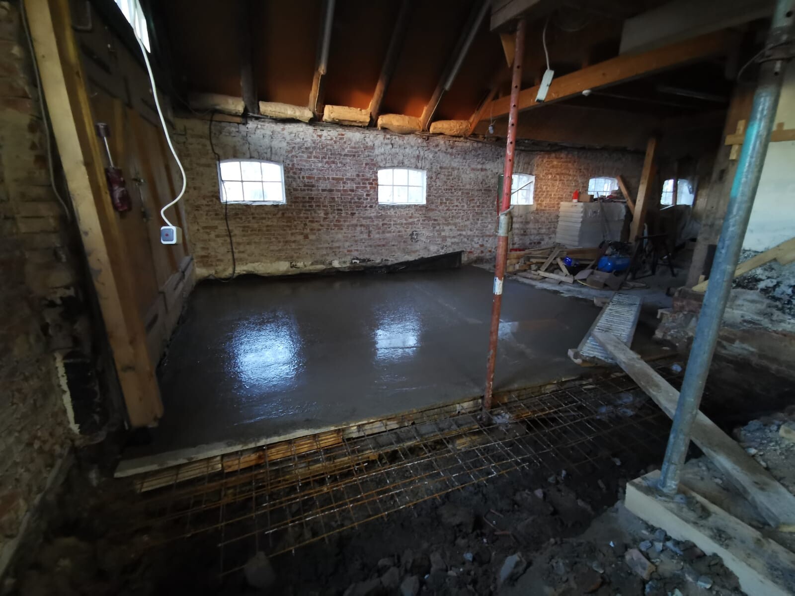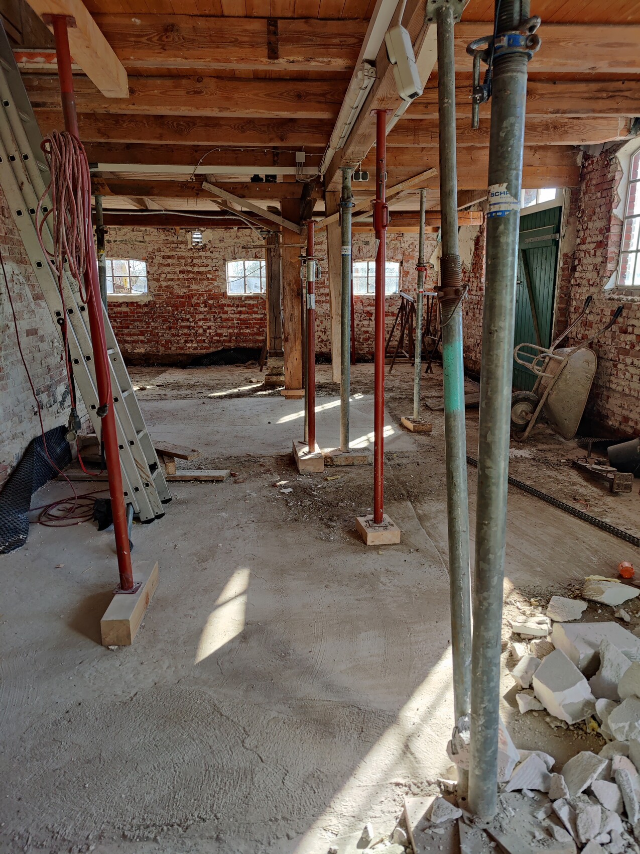 Ende März/Anfang April: Höhersetzung der Zwischendecke beenden, horizontal Sperre inkl. Verschlämmung der innenseitigen Außenmauern zmd. begonnen, Mittelpfette abgestützt, Fensterausschnitte zmd. begonnen.