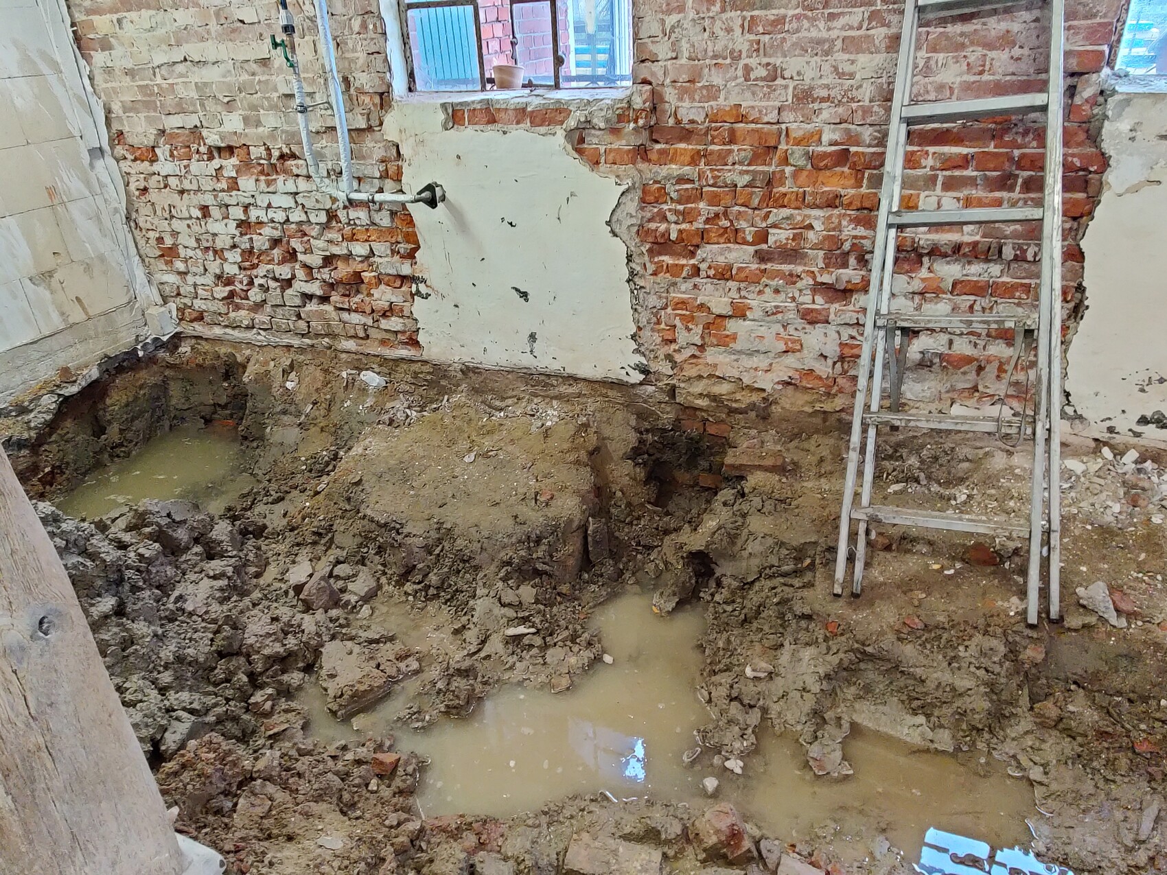 Das Problem war aber schnell gefunden: Der Überlauf der Zisterne (ehemaliges Güllefass) funktionierte aus einem, damals noch nicht genauer eruierten, Grunde nicht. Das Wasser staute sich zurück und hatte noch eine Verbindung zum ehemaligen Stall bzw. dem Erdreich. Wir vermuteten es sei verstopft. Die Handwerker haben schnell und super unkompliziert gehandelt und zwei Tauchpumpen organisiert. Eine kleine hat das Wasser aus dem Haus gepumpt, die andere das Güllefass geleert. Leider waren die Arbeiten damit für ein paar Tage auf Eis gelegt, da das Wasser erst zurück gehen musste.