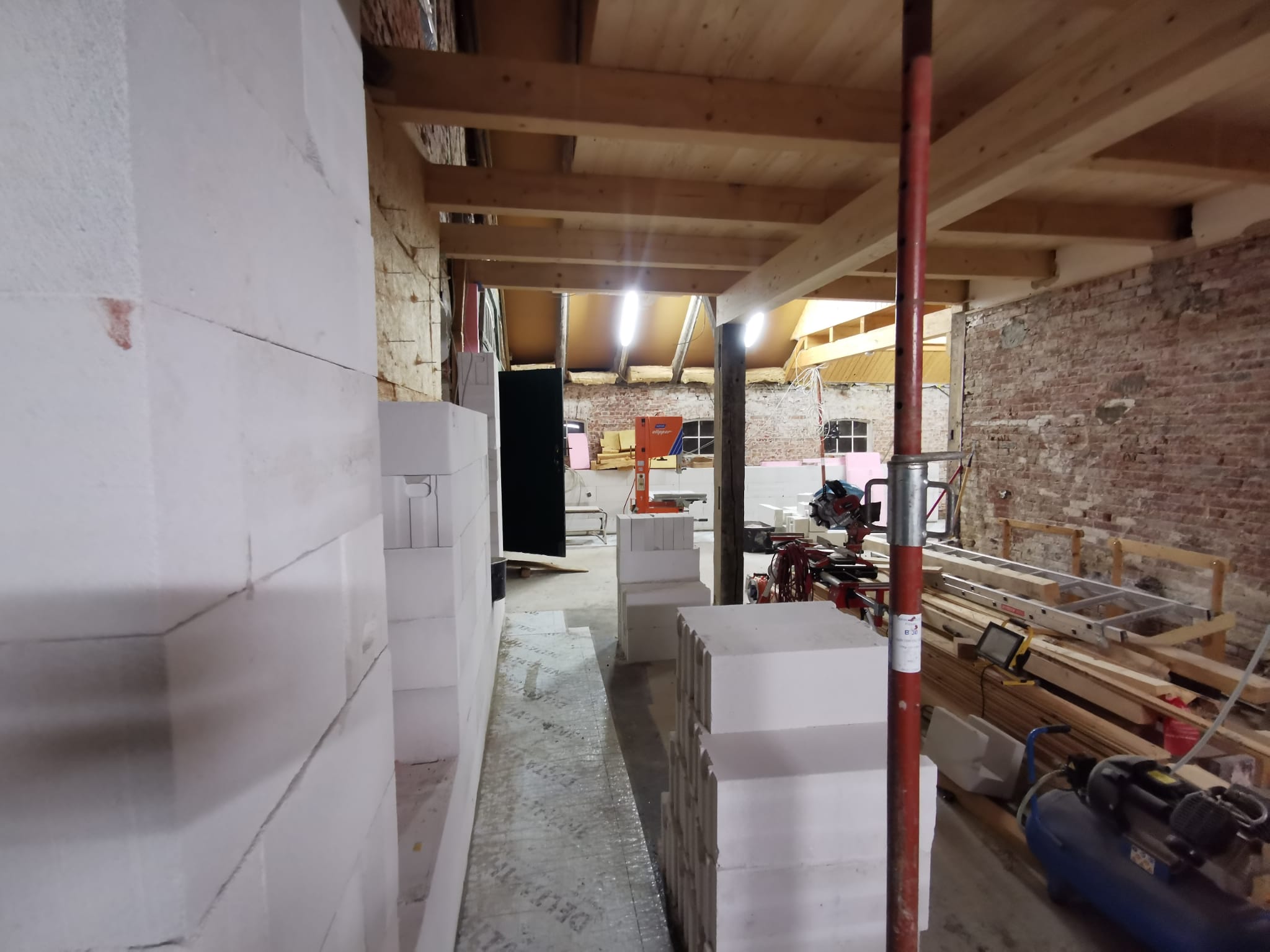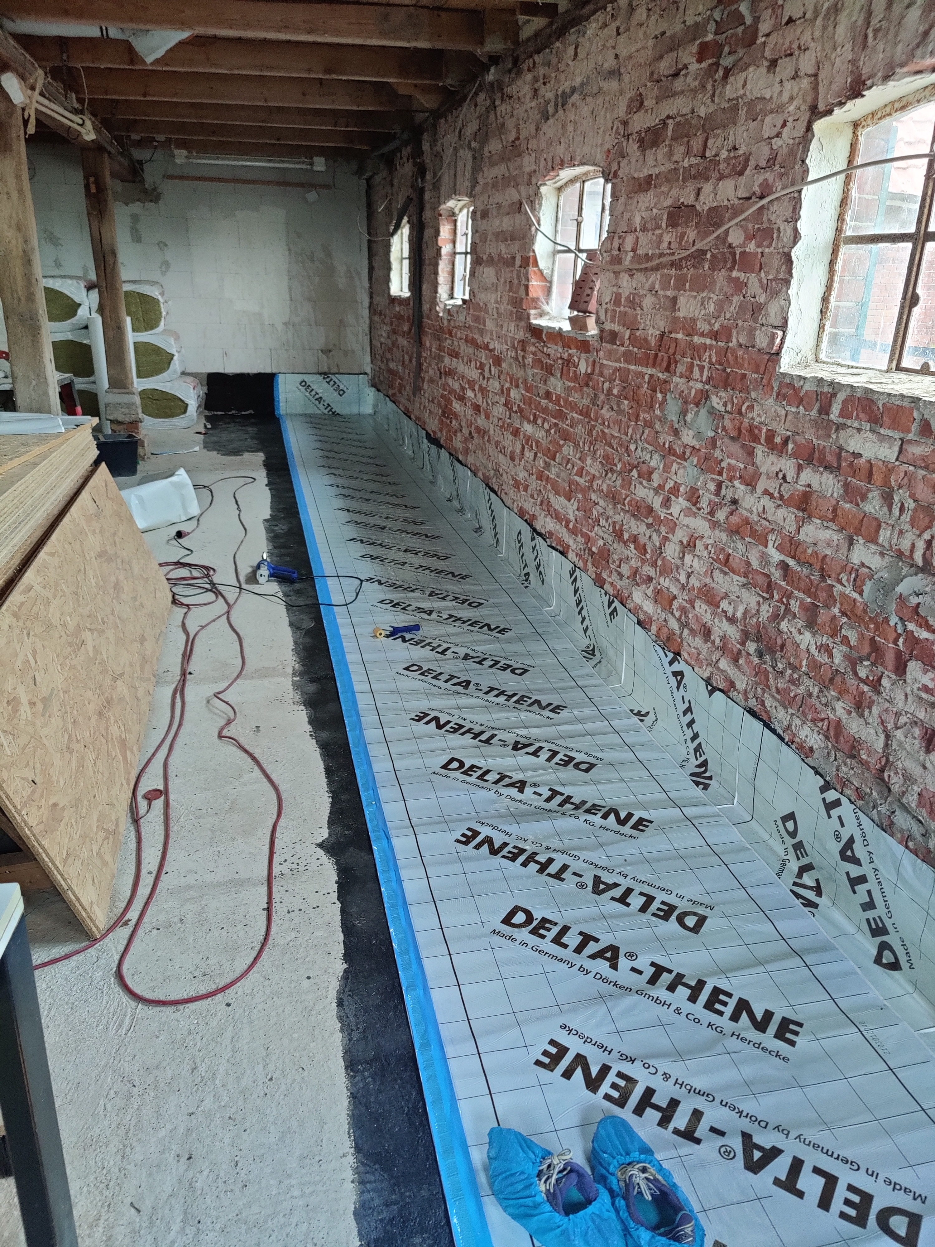 Wir haben die Trägerbalken für das Büro eingebaut, die neue Holzdecke zum Teil eingesetzt, alte Elektrik zurück gebaut und dort wo die zweite Schale (Außenwand) hinkommt Deltathene verlegt (gegen Feuchtigkeit). Alles recht unspektakulär verlaufen. Beim Abstützen des Bürobodens bzw. dem Einbau der neuen Trägerbalken war es etwas gefrickel, lief aber ansonsten ohne Zwischenfälle ab.