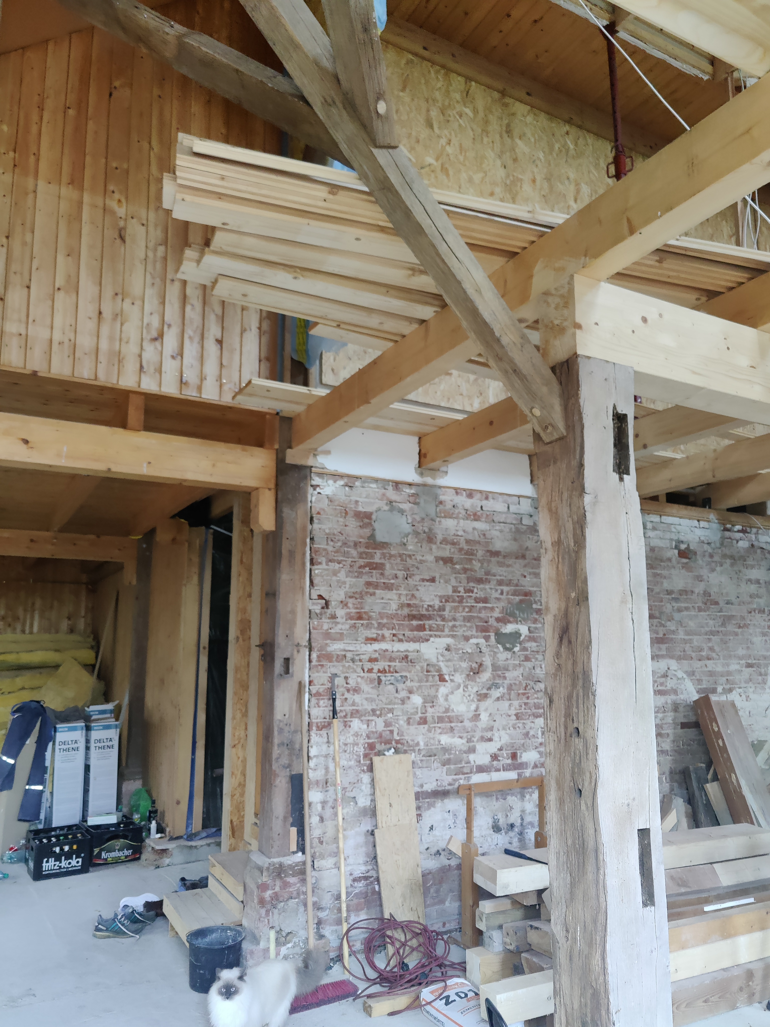 Zwischendecke: begonnen, neue Trägerbalken und die Holzbodendecke sind drin (bis auf den Bereich wo die Innendämmung der Giebelwand hochgezogen werden muss)
