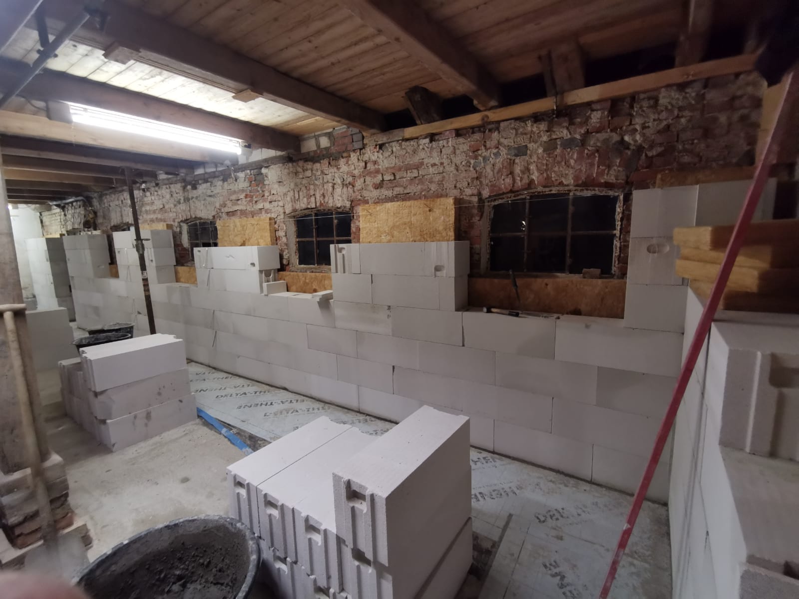 Die schiefe Außenmauer lassen wir tatsächlich abreißen. Wir hatten keine Lust das am Ende die Mauer noch weiter aus dem Lot kommt, wenn wir unten alles fertig haben. Mehrpreis rund 10 TEUR. Juhu 😀 Erst wird die neue Innenschale gemauert, dann wird die Außenmauer (Außenschale) stückweise entfernt und neu aufgebaut.