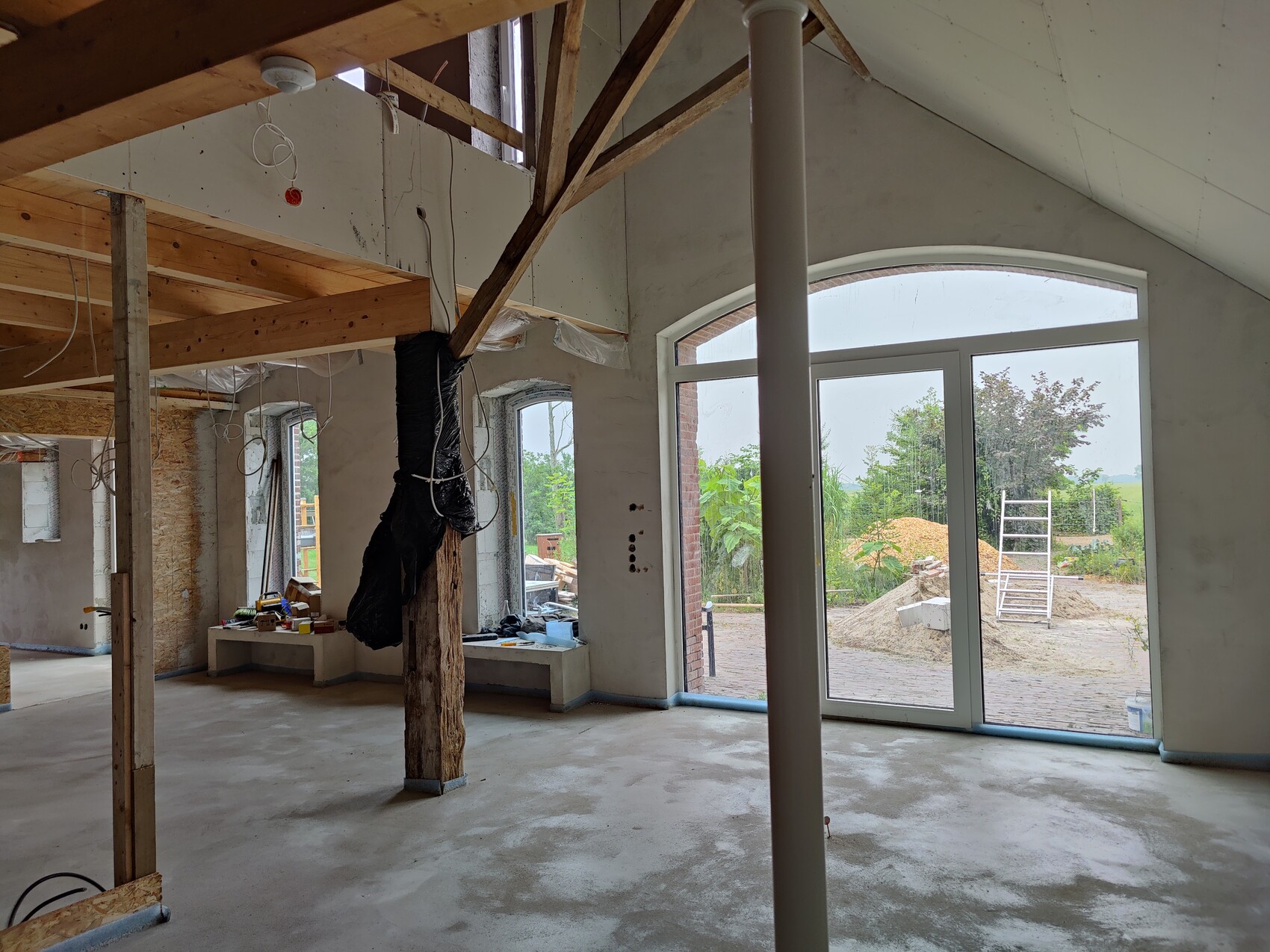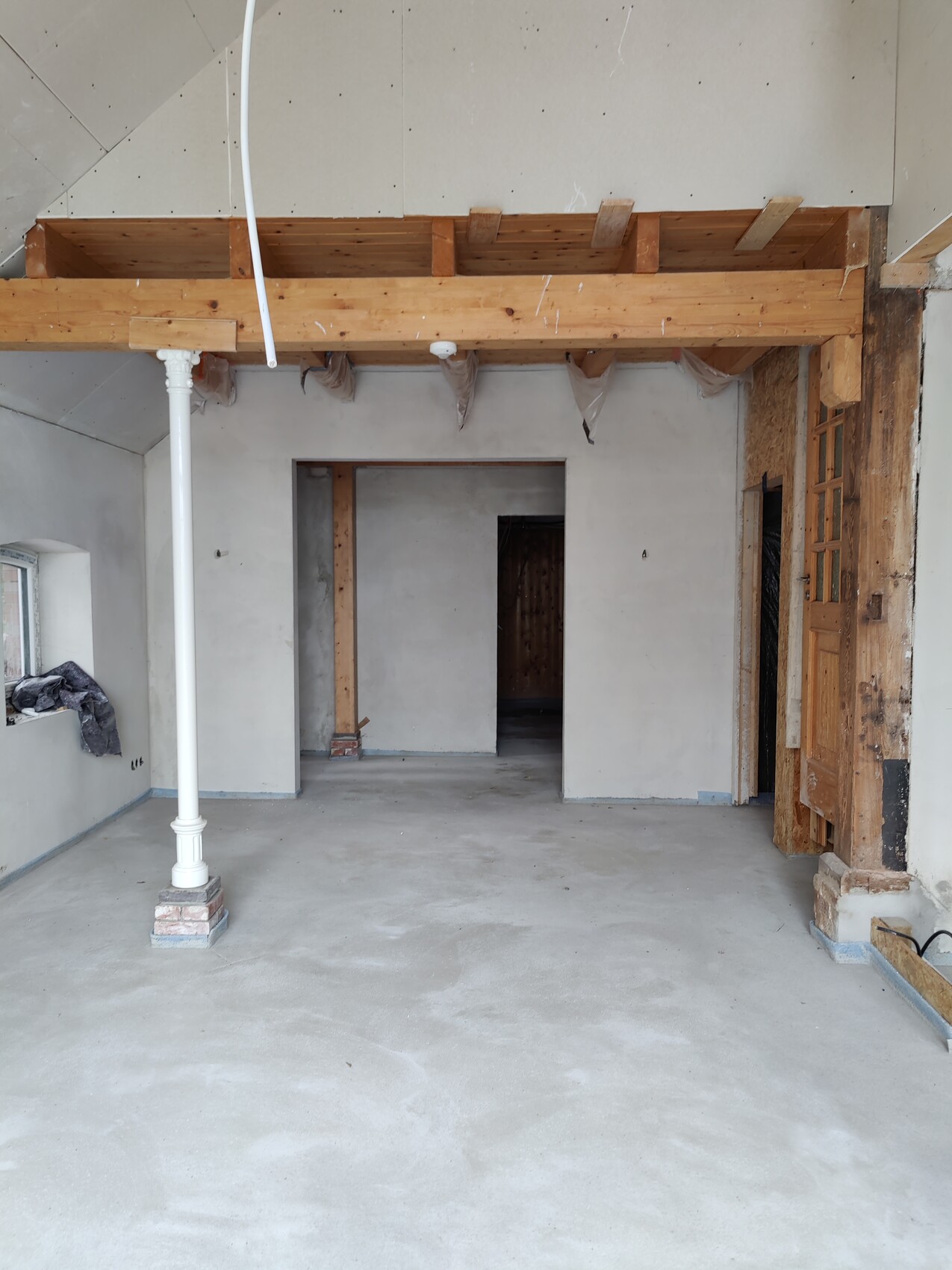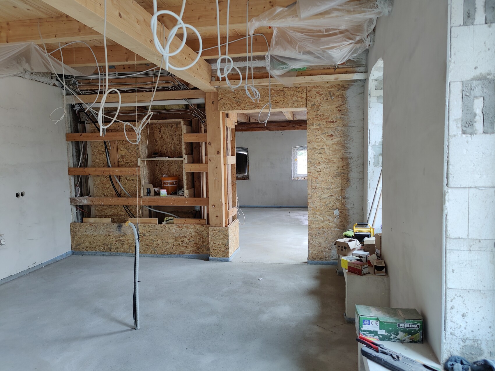 Die Elektrik ist insoweit fertig, als dass der Putzer kommen konnte. Das Dach ist gedämmt, die Fenster sind drin, die Fußbodenheizung wurde verlegt, der Estrich wurde vor ein paar Tagen eingebracht. Die Sockel für die Eichenpfeiler wurden erneuert und diverser Kleinkram erledigt.